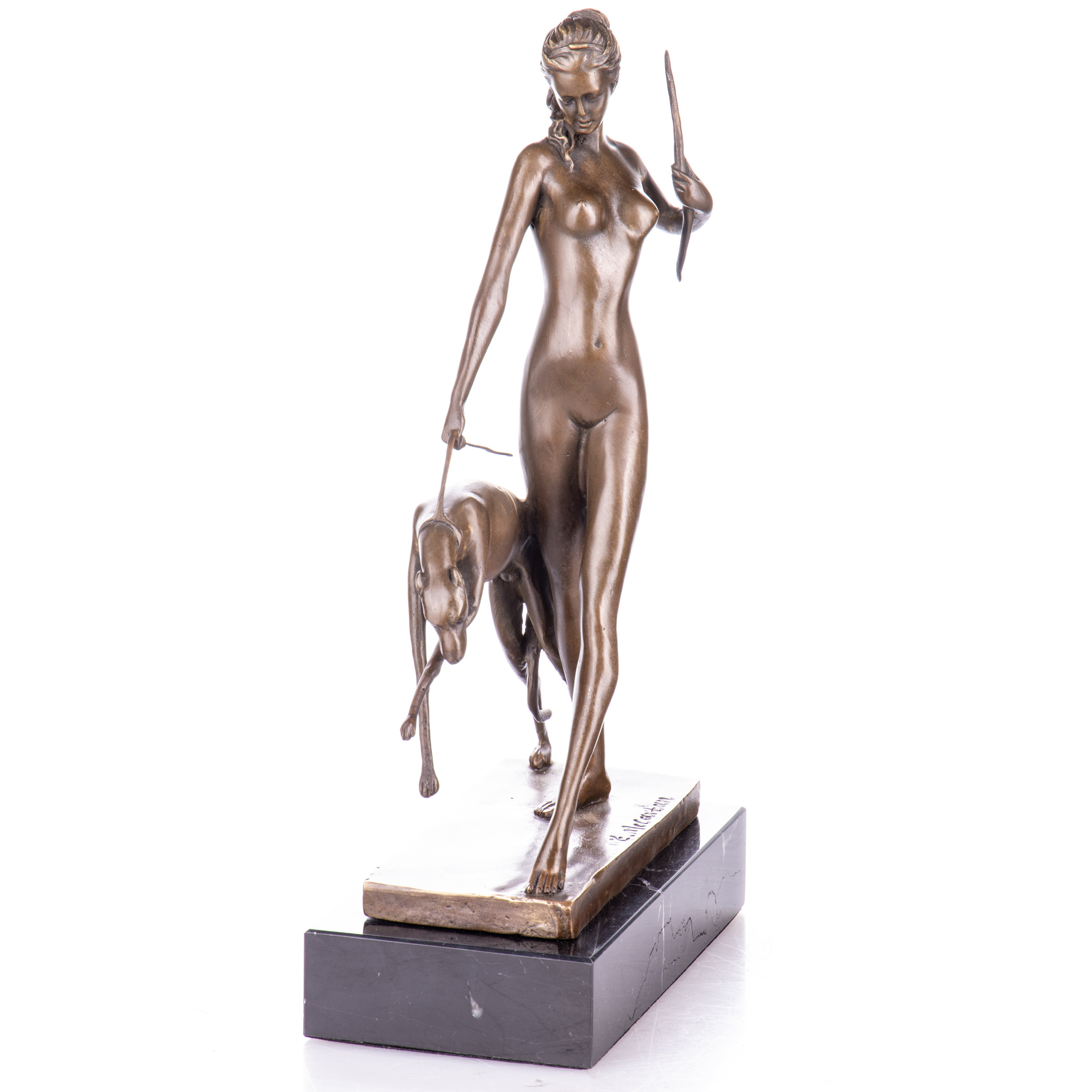 Art Deco Bronzefigur Diana mit Hund nach E.McCartan 33x18x10cm. Bronzefiguren aus verschiedenen Stilrichtungen und in unterschiedlichen Größen warten darauf, Dein häusliches Ambiente zu verzaubern. Eine Bronzefigur wirkt immer stilvoll und künstlerisch. Ob auf dem Schreibtisch oder in Regal und Vitrine, eine Bronzefigur verschönert ihre Umgebung und zieht die Blicke auf sich. Aber nicht nur in Wohnung und Haus, auch draußen, zum Beispiel im Eingangsbereich, im Garten oder am Teich kann sie ihre Wirkung entfalten. Frostsicherheit, lebenslange Haltbarkeit und edle Erscheinung sind ihre Vorteile.