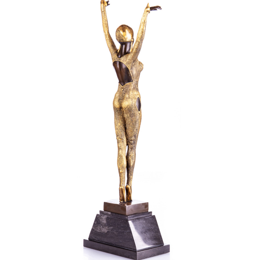 Art Deco Bronzefigur Tänzerin „Dourga“ nach D.H.Chiparus 65x21x12cm. Bronzefiguren aus verschiedenen Stilrichtungen und in unterschiedlichen Größen warten darauf, Dein häusliches Ambiente zu verzaubern. Eine Bronzefigur wirkt immer stilvoll und künstlerisch. Ob auf dem Schreibtisch oder in Regal und Vitrine, eine Bronzefigur verschönert ihre Umgebung und zieht die Blicke auf sich. Aber nicht nur in Wohnung und Haus, auch draußen, zum Beispiel im Eingangsbereich, im Garten oder am Teich kann sie ihre Wirkung entfalten. Frostsicherheit, lebenslange Haltbarkeit und edle Erscheinung sind ihre Vorteile.
