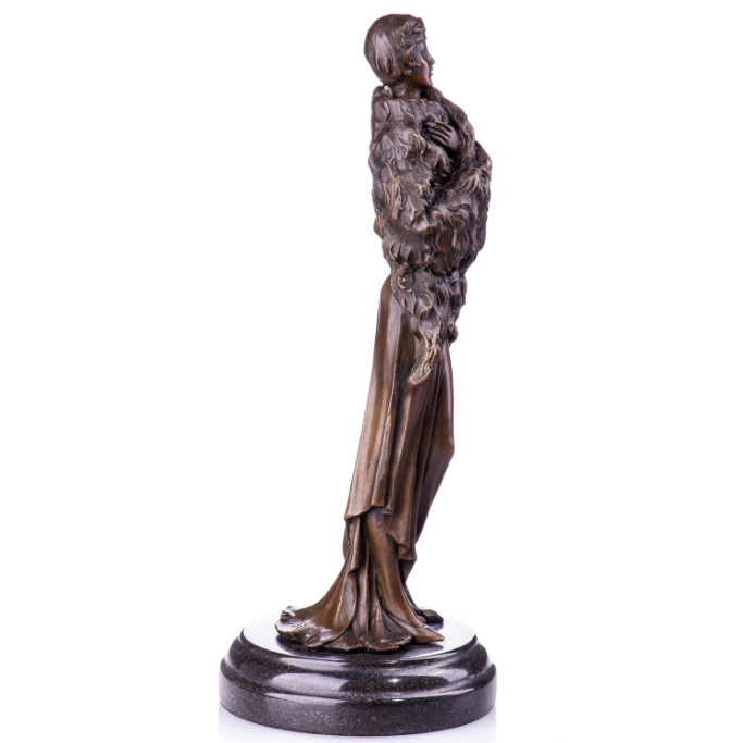 Bronze Figur „Art Deco – Frau mit Pelz“ 34cm. Bronzefiguren aus verschiedenen Stilrichtungen und in unterschiedlichen Größen warten darauf, Dein häusliches Ambiente zu verzaubern. Eine Bronzefigur wirkt immer stilvoll und künstlerisch. Ob auf dem Schreibtisch oder in Regal und Vitrine, eine Bronzefigur verschönert ihre Umgebung und zieht die Blicke auf sich. Aber nicht nur in Wohnung und Haus, auch draußen, zum Beispiel im Eingangsbereich, im Garten oder am Teich kann sie ihre Wirkung entfalten. Frostsicherheit, lebenslange Haltbarkeit und edle Erscheinung sind ihre Vorteile.
