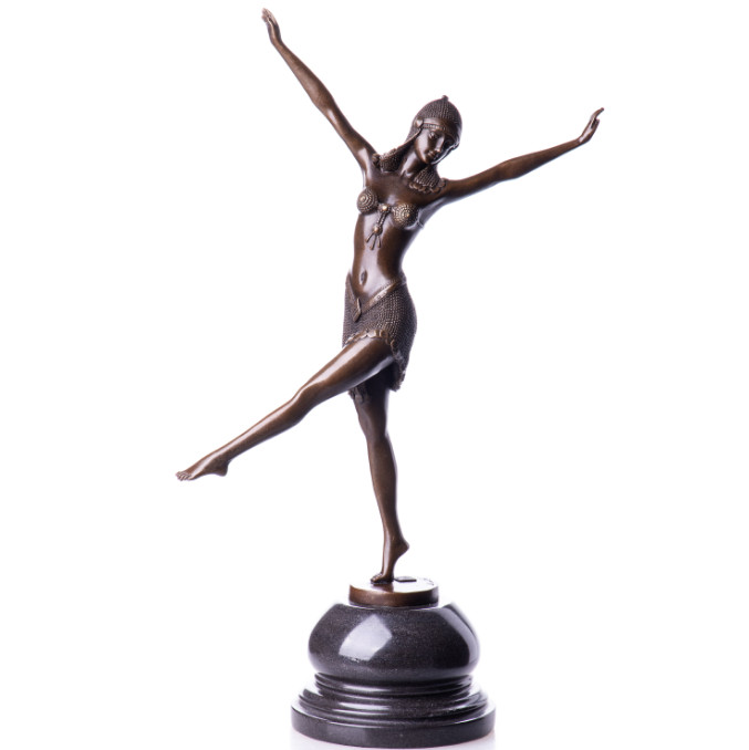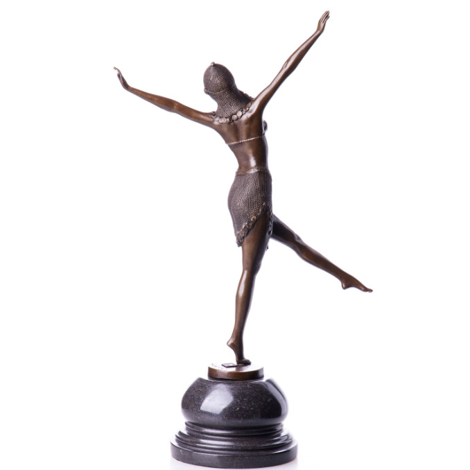 Bronze Figur „Art Deco Tänzerin“ 45cm. Bronzefiguren aus verschiedenen Stilrichtungen und in unterschiedlichen Größen warten darauf, Dein häusliches Ambiente zu verzaubern. Eine Bronzefigur wirkt immer stilvoll und künstlerisch. Ob auf dem Schreibtisch oder in Regal und Vitrine, eine Bronzefigur verschönert ihre Umgebung und zieht die Blicke auf sich. Aber nicht nur in Wohnung und Haus, auch draußen, zum Beispiel im Eingangsbereich, im Garten oder am Teich kann sie ihre Wirkung entfalten. Frostsicherheit, lebenslange Haltbarkeit und edle Erscheinung sind ihre Vorteile.