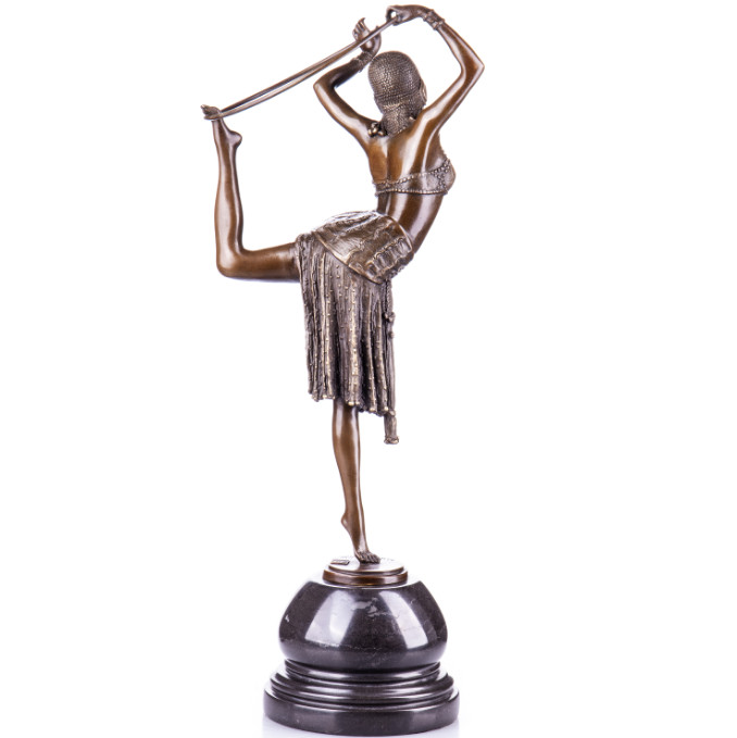 Bronze Figur „Art Deco Tänzerin mit Ring“ nach D.H.Chiparus 52cm. Bronzefiguren aus verschiedenen Stilrichtungen und in unterschiedlichen Größen warten darauf, Dein häusliches Ambiente zu verzaubern. Eine Bronzefigur wirkt immer stilvoll und künstlerisch. Ob auf dem Schreibtisch oder in Regal und Vitrine, eine Bronzefigur verschönert ihre Umgebung und zieht die Blicke auf sich. Aber nicht nur in Wohnung und Haus, auch draußen, zum Beispiel im Eingangsbereich, im Garten oder am Teich kann sie ihre Wirkung entfalten. Frostsicherheit, lebenslange Haltbarkeit und edle Erscheinung sind ihre Vorteile.
