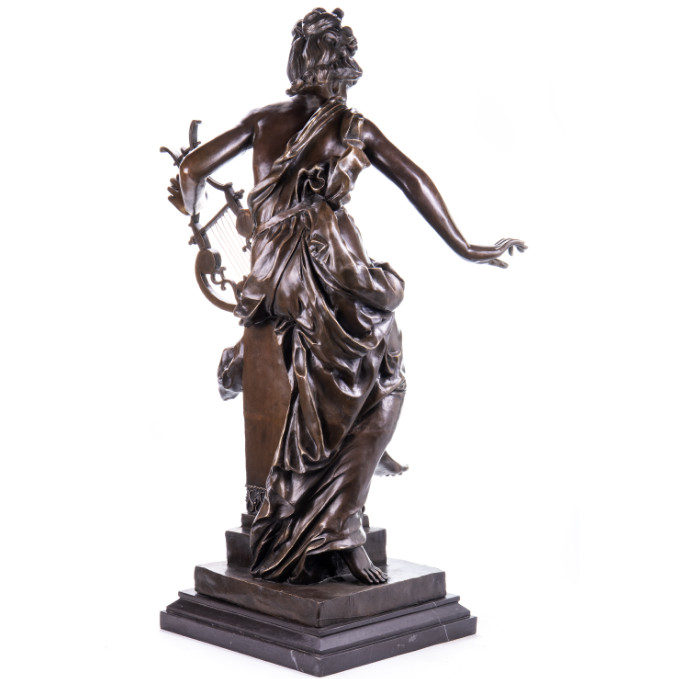 Bronze Figur „Frau mit Lyra“ 128cm. Bronzefiguren aus verschiedenen Stilrichtungen und in unterschiedlichen Größen warten darauf, Dein häusliches Ambiente zu verzaubern. Eine Bronzefigur wirkt immer stilvoll und künstlerisch. Ob auf dem Schreibtisch oder in Regal und Vitrine, eine Bronzefigur verschönert ihre Umgebung und zieht die Blicke auf sich. Aber nicht nur in Wohnung und Haus, auch draußen, zum Beispiel im Eingangsbereich, im Garten oder am Teich kann sie ihre Wirkung entfalten. Frostsicherheit, lebenslange Haltbarkeit und edle Erscheinung sind ihre Vorteile.