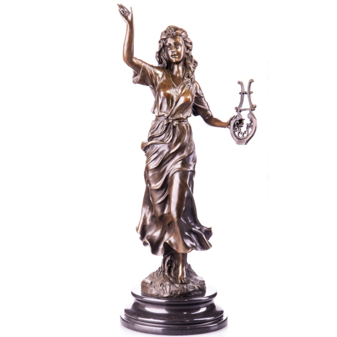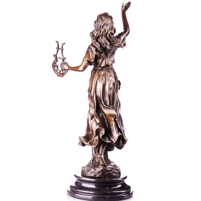 Bronze Figur „Frau mit Lyra“ 59cm. Bronzefiguren aus verschiedenen Stilrichtungen und in unterschiedlichen Größen warten darauf, Dein häusliches Ambiente zu verzaubern. Eine Bronzefigur wirkt immer stilvoll und künstlerisch. Ob auf dem Schreibtisch oder in Regal und Vitrine, eine Bronzefigur verschönert ihre Umgebung und zieht die Blicke auf sich. Aber nicht nur in Wohnung und Haus, auch draußen, zum Beispiel im Eingangsbereich, im Garten oder am Teich kann sie ihre Wirkung entfalten. Frostsicherheit, lebenslange Haltbarkeit und edle Erscheinung sind ihre Vorteile.