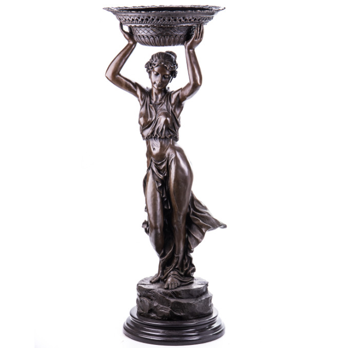 Bronze Figur „Frau mit Schale“ 115cm. Bronzefiguren aus verschiedenen Stilrichtungen und in unterschiedlichen Größen warten darauf, Dein häusliches Ambiente zu verzaubern. Eine Bronzefigur wirkt immer stilvoll und künstlerisch. Ob auf dem Schreibtisch oder in Regal und Vitrine, eine Bronzefigur verschönert ihre Umgebung und zieht die Blicke auf sich. Aber nicht nur in Wohnung und Haus, auch draußen, zum Beispiel im Eingangsbereich, im Garten oder am Teich kann sie ihre Wirkung entfalten. Frostsicherheit, lebenslange Haltbarkeit und edle Erscheinung sind ihre Vorteile.