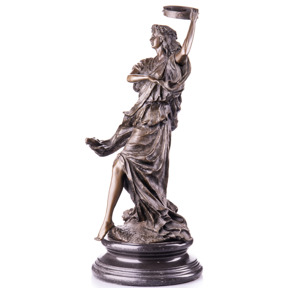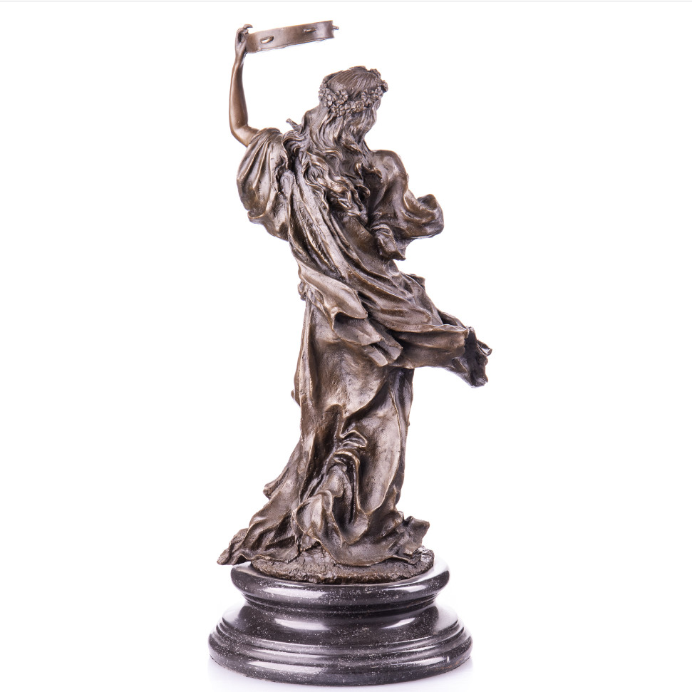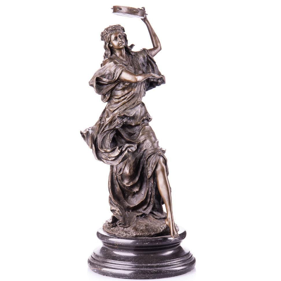 Bronze Figur „Frau mit Tambourin“ 56x24x24cm. Bronzefiguren aus verschiedenen Stilrichtungen und in unterschiedlichen Größen warten darauf, Dein häusliches Ambiente zu verzaubern. Eine Bronzefigur wirkt immer stilvoll und künstlerisch. Ob auf dem Schreibtisch oder in Regal und Vitrine, eine Bronzefigur verschönert ihre Umgebung und zieht die Blicke auf sich. Aber nicht nur in Wohnung und Haus, auch draußen, zum Beispiel im Eingangsbereich, im Garten oder am Teich kann sie ihre Wirkung entfalten. Frostsicherheit, lebenslange Haltbarkeit und edle Erscheinung sind ihre Vorteile.