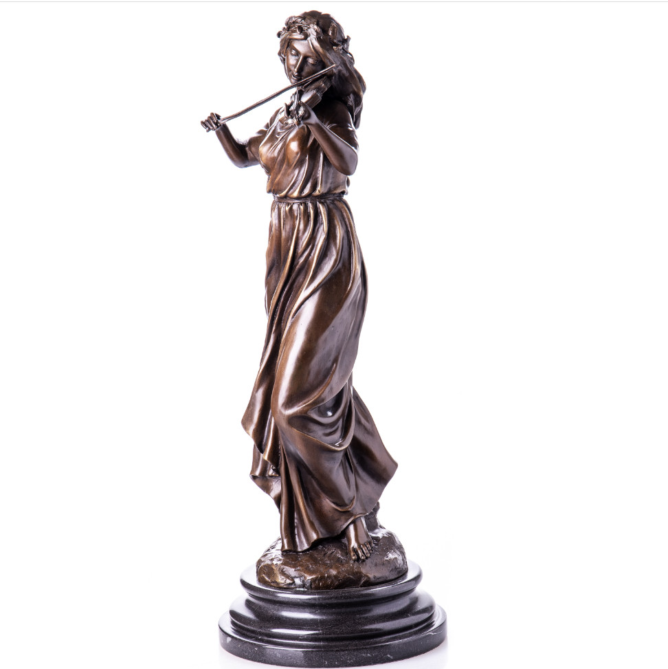 Bronze Figur „Geigerin“ 55x26x21cm. Bronzefiguren aus verschiedenen Stilrichtungen und in unterschiedlichen Größen warten darauf, Dein häusliches Ambiente zu verzaubern. Eine Bronzefigur wirkt immer stilvoll und künstlerisch. Ob auf dem Schreibtisch oder in Regal und Vitrine, eine Bronzefigur verschönert ihre Umgebung und zieht die Blicke auf sich. Aber nicht nur in Wohnung und Haus, auch draußen, zum Beispiel im Eingangsbereich, im Garten oder am Teich kann sie ihre Wirkung entfalten. Frostsicherheit, lebenslange Haltbarkeit und edle Erscheinung sind ihre Vorteile.