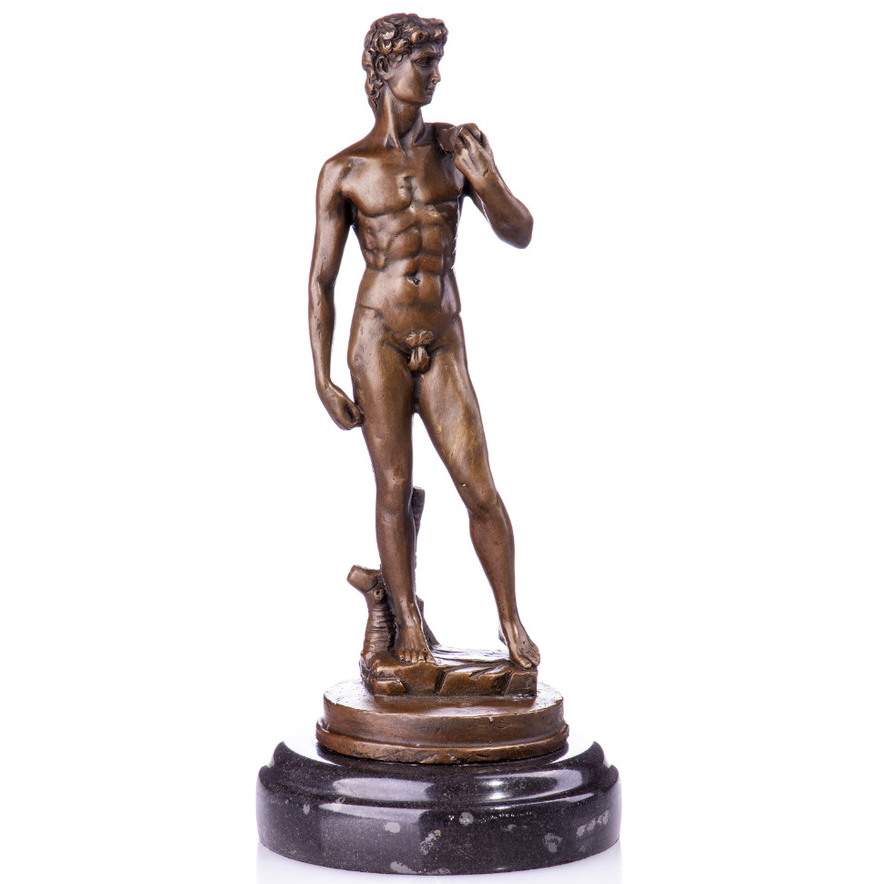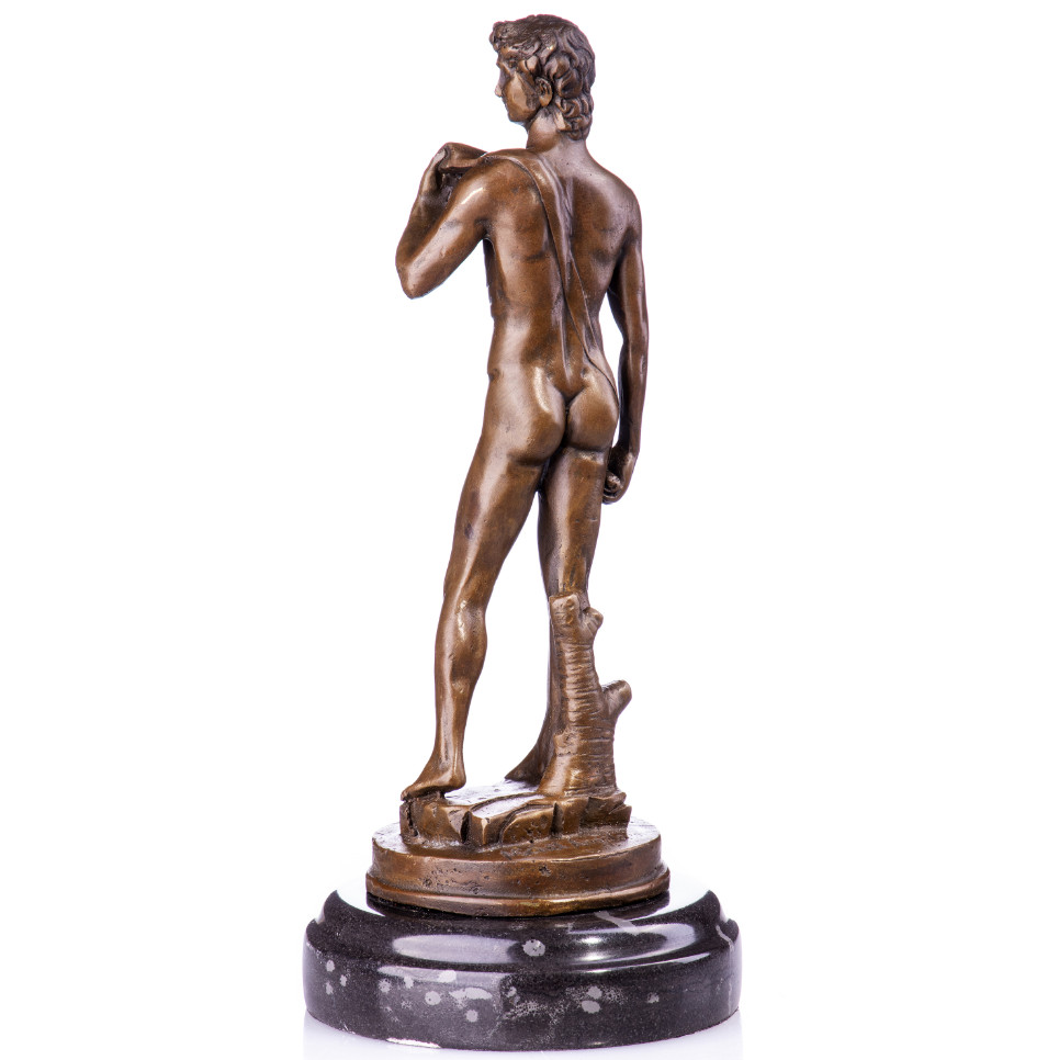 Bronze Figur Götter „David“ nach Michelangelo 28x12x12cm. Bronzefiguren aus verschiedenen Stilrichtungen und in unterschiedlichen Größen warten darauf, Dein häusliches Ambiente zu verzaubern. Eine Bronzefigur wirkt immer stilvoll und künstlerisch. Ob auf dem Schreibtisch oder in Regal und Vitrine, eine Bronzefigur verschönert ihre Umgebung und zieht die Blicke auf sich. Aber nicht nur in Wohnung und Haus, auch draußen, zum Beispiel im Eingangsbereich, im Garten oder am Teich kann sie ihre Wirkung entfalten. Frostsicherheit, lebenslange Haltbarkeit und edle Erscheinung sind ihre Vorteile.