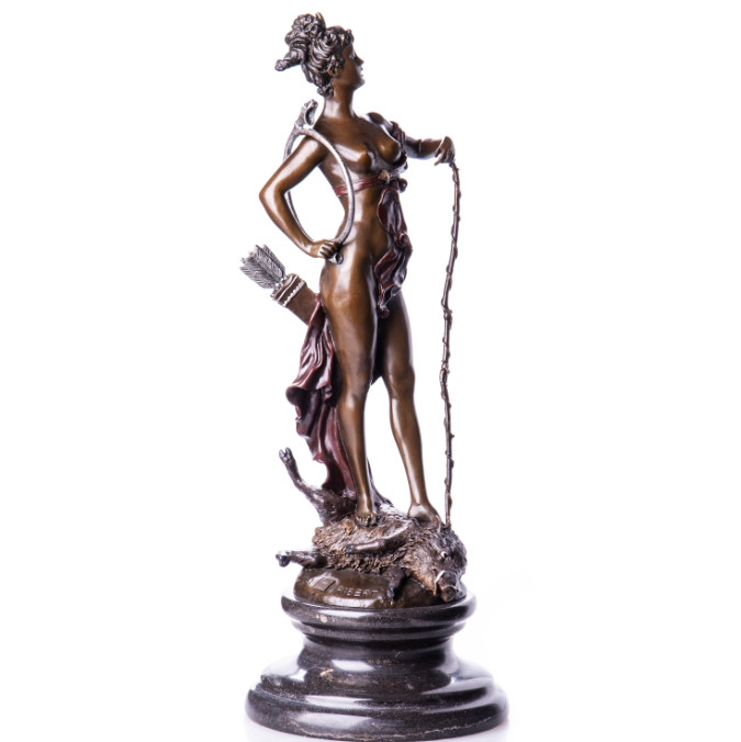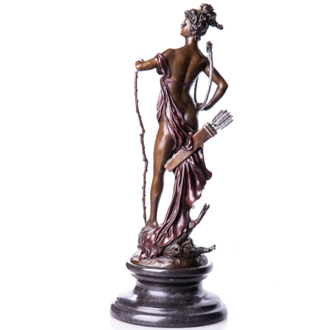 Bronze Figur Götter „Diana bei der Jagd“ 49x17x17cm. Bronzefiguren aus verschiedenen Stilrichtungen und in unterschiedlichen Größen warten darauf, Dein häusliches Ambiente zu verzaubern. Eine Bronzefigur wirkt immer stilvoll und künstlerisch. Ob auf dem Schreibtisch oder in Regal und Vitrine, eine Bronzefigur verschönert ihre Umgebung und zieht die Blicke auf sich. Aber nicht nur in Wohnung und Haus, auch draußen, zum Beispiel im Eingangsbereich, im Garten oder am Teich kann sie ihre Wirkung entfalten. Frostsicherheit, lebenslange Haltbarkeit und edle Erscheinung sind ihre Vorteile.