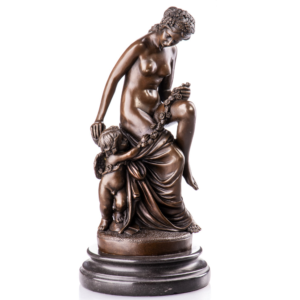 Bronze Figur Götter „Venus und Amor“ 34x15x15cm. Bronzefiguren aus verschiedenen Stilrichtungen und in unterschiedlichen Größen warten darauf, Dein häusliches Ambiente zu verzaubern. Eine Bronzefigur wirkt immer stilvoll und künstlerisch. Ob auf dem Schreibtisch oder in Regal und Vitrine, eine Bronzefigur verschönert ihre Umgebung und zieht die Blicke auf sich. Aber nicht nur in Wohnung und Haus, auch draußen, zum Beispiel im Eingangsbereich, im Garten oder am Teich kann sie ihre Wirkung entfalten. Frostsicherheit, lebenslange Haltbarkeit und edle Erscheinung sind ihre Vorteile.