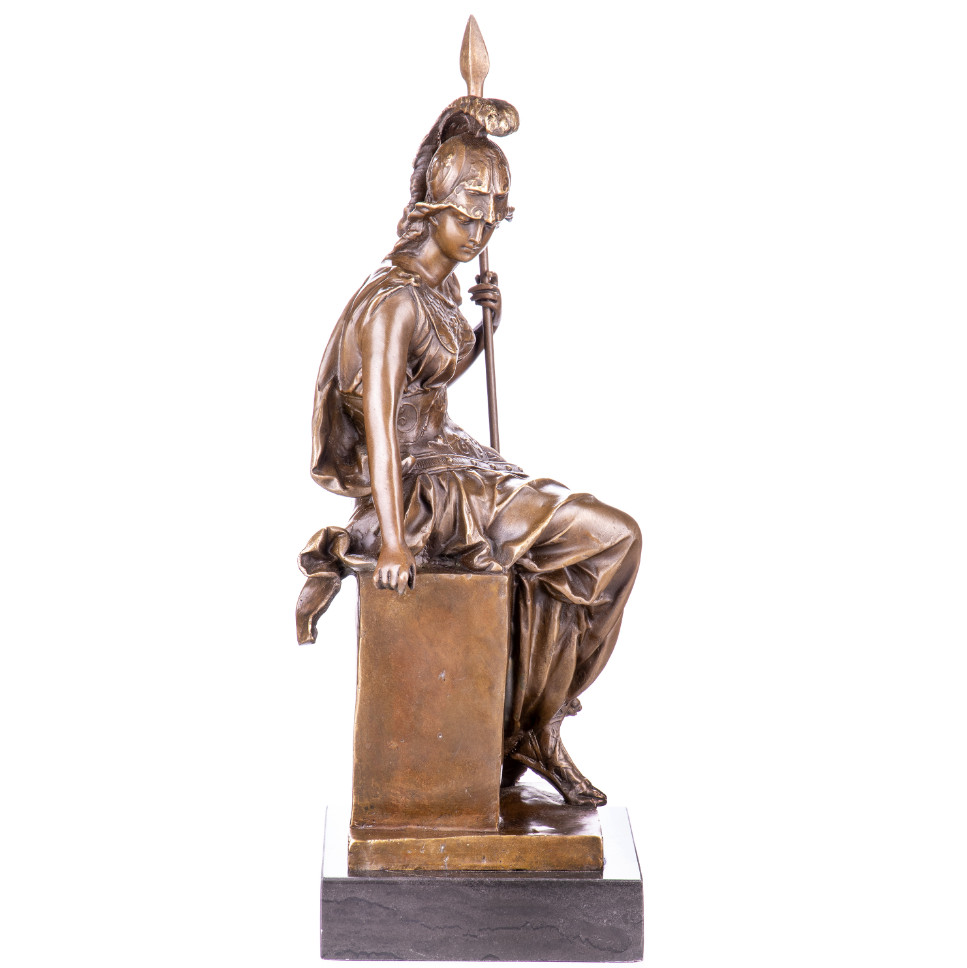 Bronze Figur „Griechische Kriegsgöttin Athena mit Speer“ 46x18x16cm. Bronzefiguren aus verschiedenen Stilrichtungen und in unterschiedlichen Größen warten darauf, Dein häusliches Ambiente zu verzaubern. Eine Bronzefigur wirkt immer stilvoll und künstlerisch. Ob auf dem Schreibtisch oder in Regal und Vitrine, eine Bronzefigur verschönert ihre Umgebung und zieht die Blicke auf sich. Aber nicht nur in Wohnung und Haus, auch draußen, zum Beispiel im Eingangsbereich, im Garten oder am Teich kann sie ihre Wirkung entfalten. Frostsicherheit, lebenslange Haltbarkeit und edle Erscheinung sind ihre Vorteile.