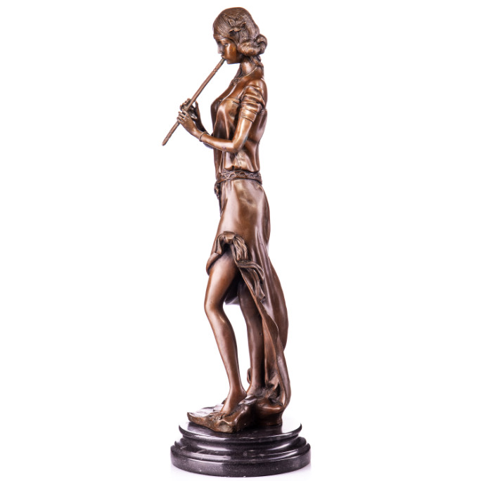 Bronze Figur Jugendstil – „Frau mit Flöte“ 52cm. Bronzefiguren aus verschiedenen Stilrichtungen und in unterschiedlichen Größen warten darauf, Dein häusliches Ambiente zu verzaubern. Eine Bronzefigur wirkt immer stilvoll und künstlerisch. Ob auf dem Schreibtisch oder in Regal und Vitrine, eine Bronzefigur verschönert ihre Umgebung und zieht die Blicke auf sich. Aber nicht nur in Wohnung und Haus, auch draußen, zum Beispiel im Eingangsbereich, im Garten oder am Teich kann sie ihre Wirkung entfalten. Frostsicherheit, lebenslange Haltbarkeit und edle Erscheinung sind ihre Vorteile.