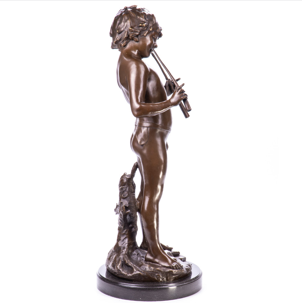 Bronze Figur „Junge mit Flöte“ 70x27x27cm. Bronzefiguren aus verschiedenen Stilrichtungen und in unterschiedlichen Größen warten darauf, Dein häusliches Ambiente zu verzaubern. Eine Bronzefigur wirkt immer stilvoll und künstlerisch. Ob auf dem Schreibtisch oder in Regal und Vitrine, eine Bronzefigur verschönert ihre Umgebung und zieht die Blicke auf sich. Aber nicht nur in Wohnung und Haus, auch draußen, zum Beispiel im Eingangsbereich, im Garten oder am Teich kann sie ihre Wirkung entfalten. Frostsicherheit, lebenslange Haltbarkeit und edle Erscheinung sind ihre Vorteile.