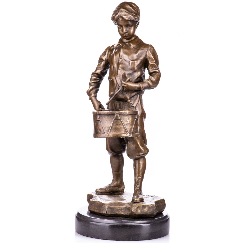Bronze Figur „Junge mit Trommel“ 37x17x15cm. Bronzefiguren aus verschiedenen Stilrichtungen und in unterschiedlichen Größen warten darauf, Dein häusliches Ambiente zu verzaubern. Eine Bronzefigur wirkt immer stilvoll und künstlerisch. Ob auf dem Schreibtisch oder in Regal und Vitrine, eine Bronzefigur verschönert ihre Umgebung und zieht die Blicke auf sich. Aber nicht nur in Wohnung und Haus, auch draußen, zum Beispiel im Eingangsbereich, im Garten oder am Teich kann sie ihre Wirkung entfalten. Frostsicherheit, lebenslange Haltbarkeit und edle Erscheinung sind ihre Vorteile.