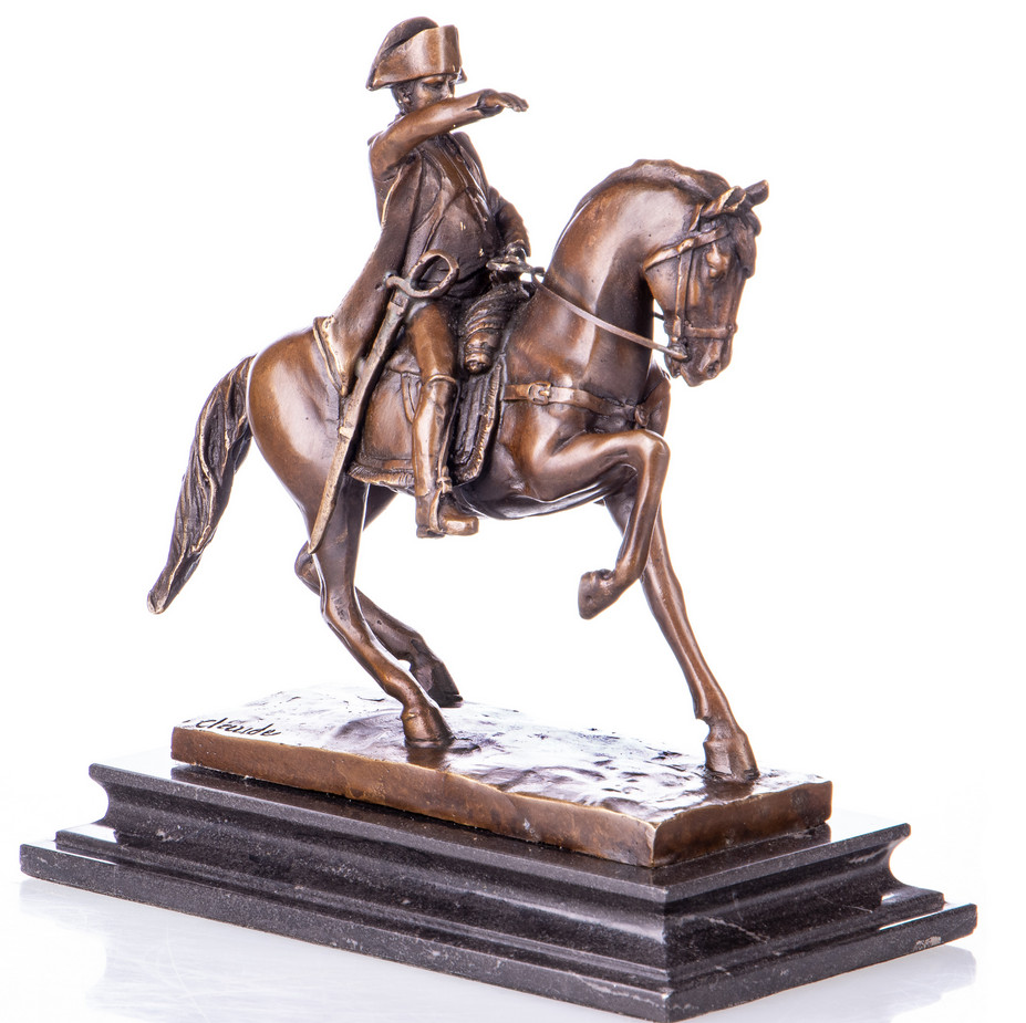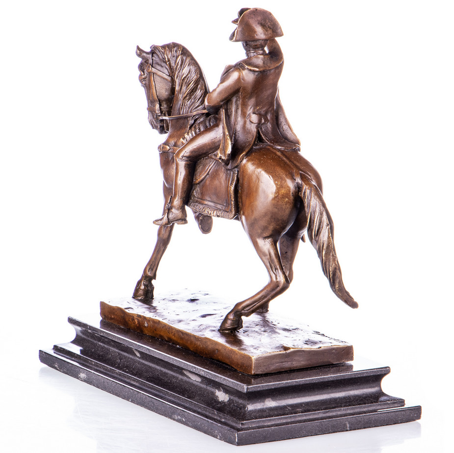Bronze Figur Kaiser – „Napoleon auf Pferd“ 23x23x10cm. Bronzefiguren aus verschiedenen Stilrichtungen und in unterschiedlichen Größen warten darauf, Dein häusliches Ambiente zu verzaubern. Eine Bronzefigur wirkt immer stilvoll und künstlerisch. Ob auf dem Schreibtisch oder in Regal und Vitrine, eine Bronzefigur verschönert ihre Umgebung und zieht die Blicke auf sich. Aber nicht nur in Wohnung und Haus, auch draußen, zum Beispiel im Eingangsbereich, im Garten oder am Teich kann sie ihre Wirkung entfalten. Frostsicherheit, lebenslange Haltbarkeit und edle Erscheinung sind ihre Vorteile.