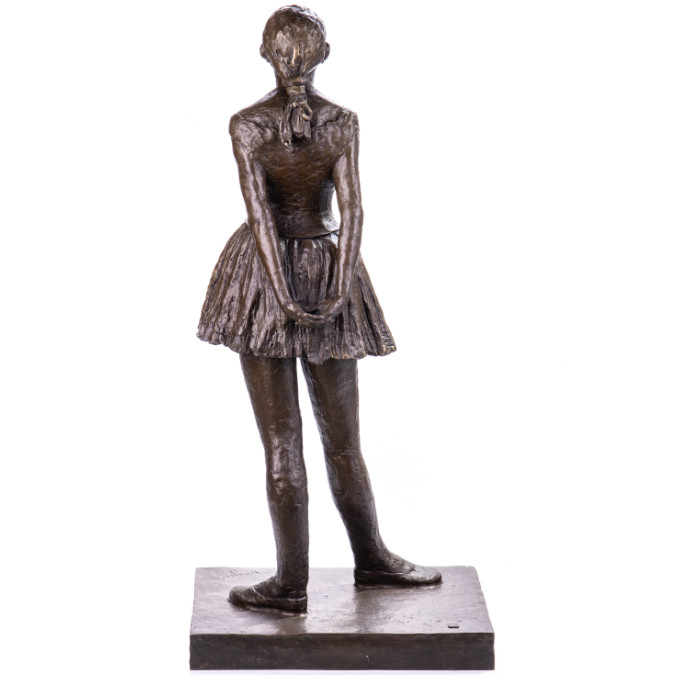 Bronze Figur „Kleine Vierzehnjährige Tänzerin“ nach Degas 96cm. Bronzefiguren aus verschiedenen Stilrichtungen und in unterschiedlichen Größen warten darauf, Dein häusliches Ambiente zu verzaubern. Eine Bronzefigur wirkt immer stilvoll und künstlerisch. Ob auf dem Schreibtisch oder in Regal und Vitrine, eine Bronzefigur verschönert ihre Umgebung und zieht die Blicke auf sich. Aber nicht nur in Wohnung und Haus, auch draußen, zum Beispiel im Eingangsbereich, im Garten oder am Teich kann sie ihre Wirkung entfalten. Frostsicherheit, lebenslange Haltbarkeit und edle Erscheinung sind ihre Vorteile.