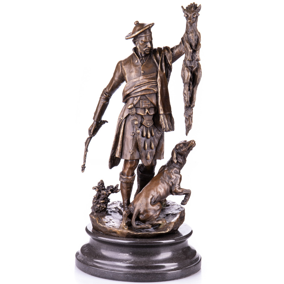 Bronze Figur Mann – „Jäger mit Jagdhund und Fuchs Schottischer Jäger“ nach P.J.Mene 56x28x26cm. Bronzefiguren aus verschiedenen Stilrichtungen und in unterschiedlichen Größen warten darauf, Dein häusliches Ambiente zu verzaubern. Eine Bronzefigur wirkt immer stilvoll und künstlerisch. Ob auf dem Schreibtisch oder in Regal und Vitrine, eine Bronzefigur verschönert ihre Umgebung und zieht die Blicke auf sich. Aber nicht nur in Wohnung und Haus, auch draußen, zum Beispiel im Eingangsbereich, im Garten oder am Teich kann sie ihre Wirkung entfalten. Frostsicherheit, lebenslange Haltbarkeit und edle Erscheinung sind ihre Vorteile.