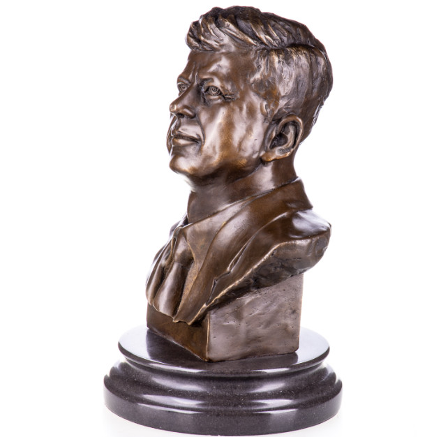 Bronzefigur Politik Büste „John F. Kennedy“ 27cm. Bronzefiguren aus verschiedenen Stilrichtungen und in unterschiedlichen Größen warten darauf, Dein häusliches Ambiente zu verzaubern. Eine Bronzefigur wirkt immer stilvoll und künstlerisch. Ob auf dem Schreibtisch oder in Regal und Vitrine, eine Bronzefigur verschönert ihre Umgebung und zieht die Blicke auf sich. Aber nicht nur in Wohnung und Haus, auch draußen, zum Beispiel im Eingangsbereich, im Garten oder am Teich kann sie ihre Wirkung entfalten. Frostsicherheit, lebenslange Haltbarkeit und edle Erscheinung sind ihre Vorteile.