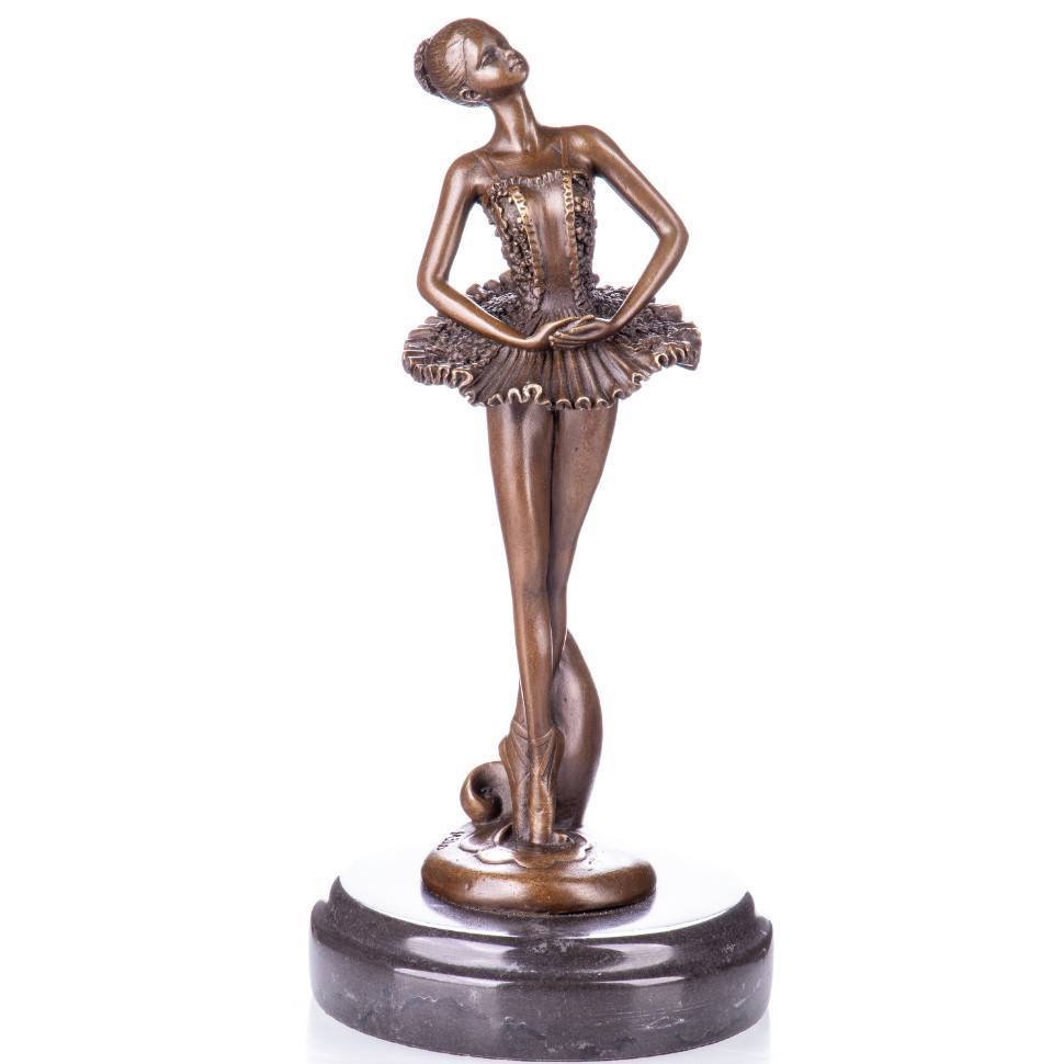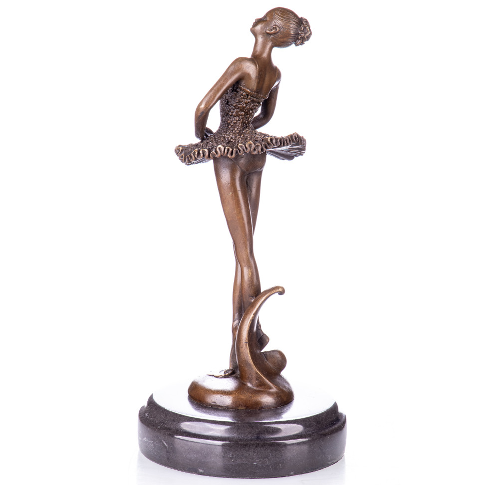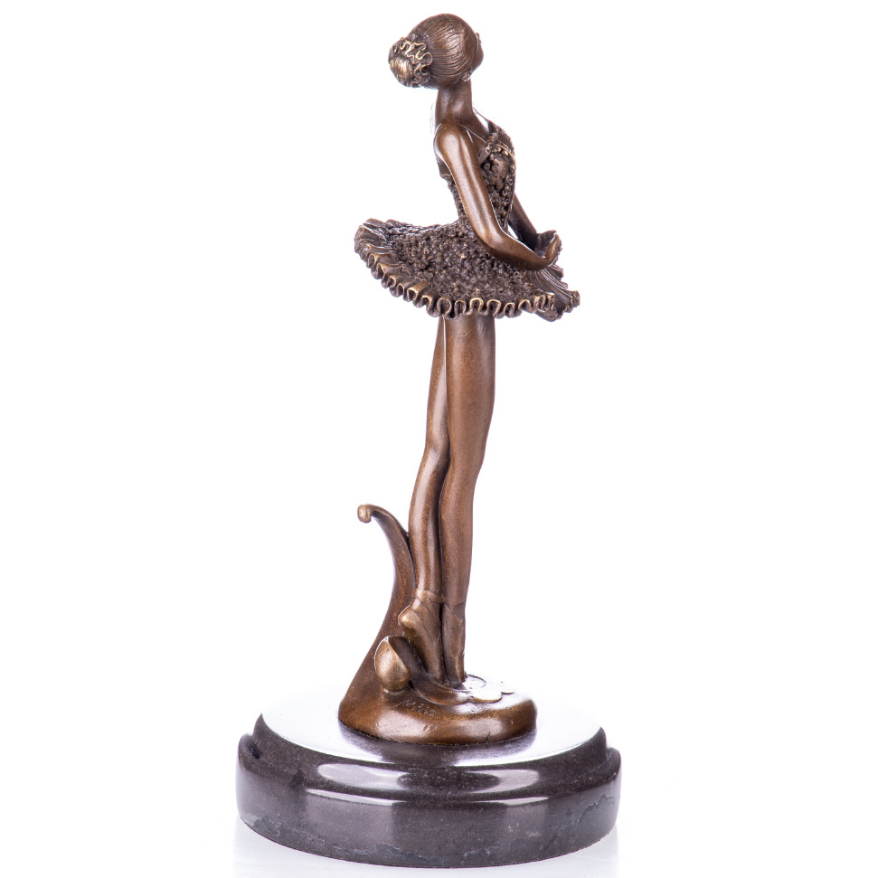 Bronze Figur „Tänzerin Ballerina“ 26x12x12cm. Bronzefiguren aus verschiedenen Stilrichtungen und in unterschiedlichen Größen warten darauf, Dein häusliches Ambiente zu verzaubern. Eine Bronzefigur wirkt immer stilvoll und künstlerisch. Ob auf dem Schreibtisch oder in Regal und Vitrine, eine Bronzefigur verschönert ihre Umgebung und zieht die Blicke auf sich. Aber nicht nur in Wohnung und Haus, auch draußen, zum Beispiel im Eingangsbereich, im Garten oder am Teich kann sie ihre Wirkung entfalten. Frostsicherheit, lebenslange Haltbarkeit und edle Erscheinung sind ihre Vorteile.