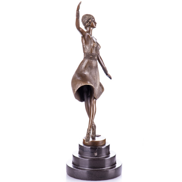 Bronze Figur „Tänzerin – Russische Ballerina“ nach D.H.Chiparus 35cm. Bronzefiguren aus verschiedenen Stilrichtungen und in unterschiedlichen Größen warten darauf, Dein häusliches Ambiente zu verzaubern. Eine Bronzefigur wirkt immer stilvoll und künstlerisch. Ob auf dem Schreibtisch oder in Regal und Vitrine, eine Bronzefigur verschönert ihre Umgebung und zieht die Blicke auf sich. Aber nicht nur in Wohnung und Haus, auch draußen, zum Beispiel im Eingangsbereich, im Garten oder am Teich kann sie ihre Wirkung entfalten. Frostsicherheit, lebenslange Haltbarkeit und edle Erscheinung sind ihre Vorteile.