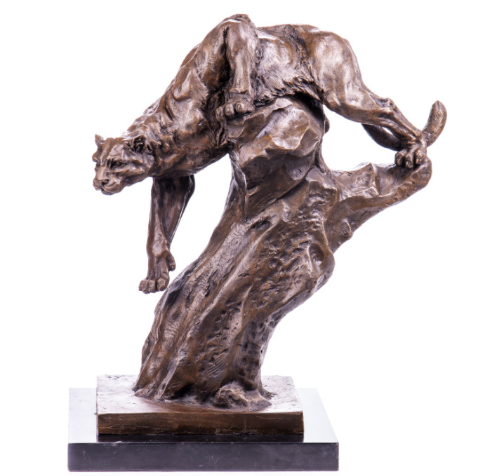 Bronze Figur Tier „Panther“ 60x60x32cm. Bronzefiguren aus verschiedenen Stilrichtungen und in unterschiedlichen Größen warten darauf, Dein häusliches Ambiente zu verzaubern. Eine Bronzefigur wirkt immer stilvoll und künstlerisch. Ob auf dem Schreibtisch oder in Regal und Vitrine, eine Bronzefigur verschönert ihre Umgebung und zieht die Blicke auf sich. Aber nicht nur in Wohnung und Haus, auch draußen, zum Beispiel im Eingangsbereich, im Garten oder am Teich kann sie ihre Wirkung entfalten. Frostsicherheit, lebenslange Haltbarkeit und edle Erscheinung sind ihre Vorteile.