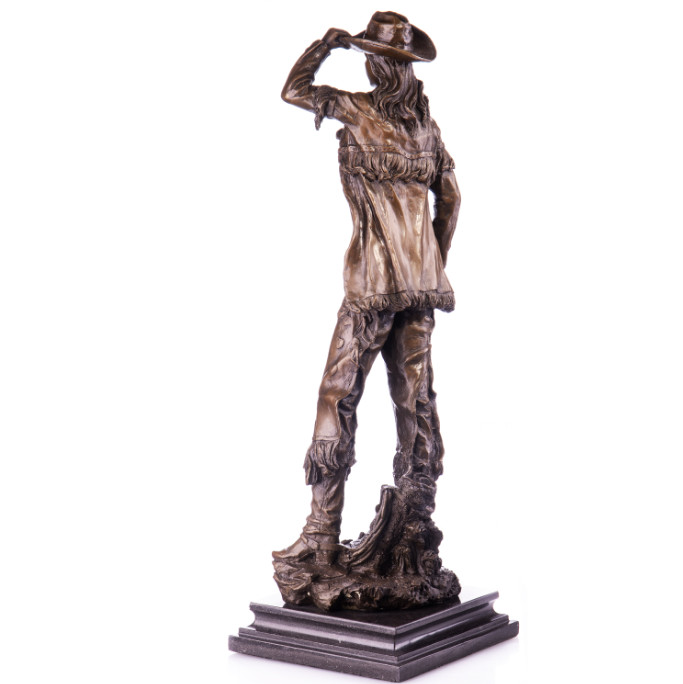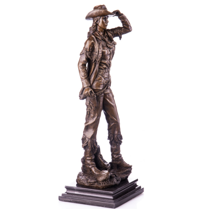 Bronze Figur Western „Cowgirl“ 55cm. Bronzefiguren aus verschiedenen Stilrichtungen und in unterschiedlichen Größen warten darauf, Dein häusliches Ambiente zu verzaubern. Eine Bronzefigur wirkt immer stilvoll und künstlerisch. Ob auf dem Schreibtisch oder in Regal und Vitrine, eine Bronzefigur verschönert ihre Umgebung und zieht die Blicke auf sich. Aber nicht nur in Wohnung und Haus, auch draußen, zum Beispiel im Eingangsbereich, im Garten oder am Teich kann sie ihre Wirkung entfalten. Frostsicherheit, lebenslange Haltbarkeit und edle Erscheinung sind ihre Vorteile.