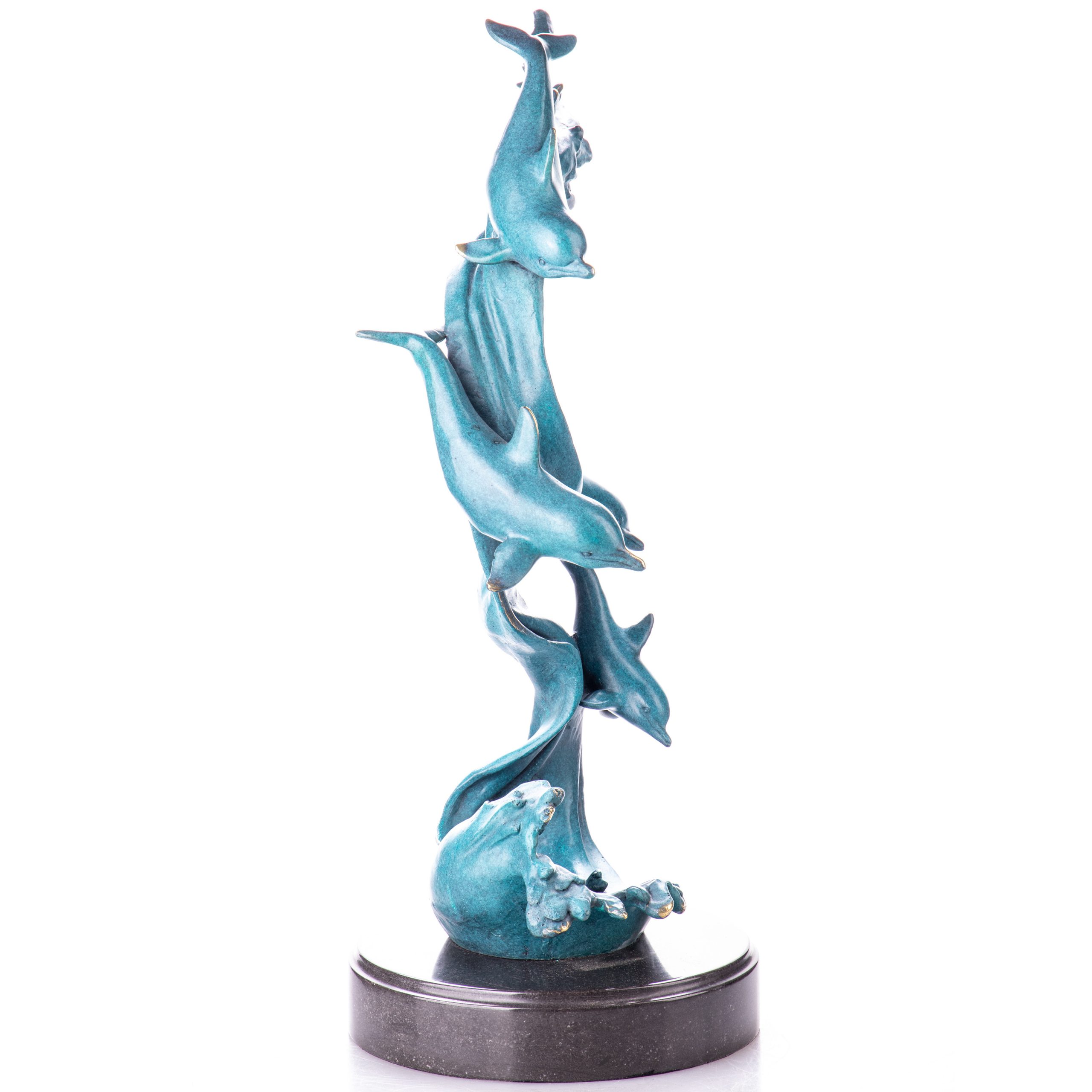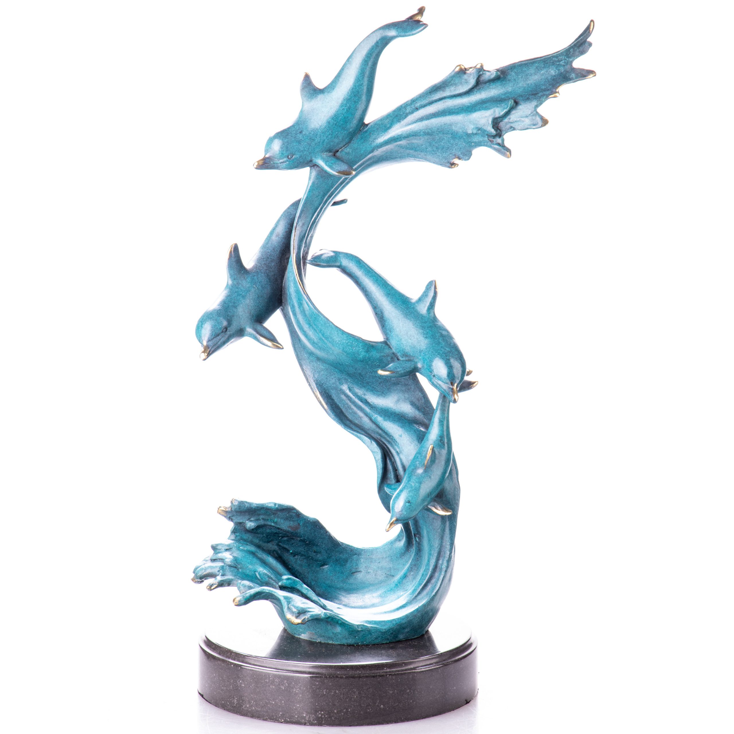Bronzefigur „Delfine mit grüner Patina“ 47x27x20cm. Bronzefiguren aus verschiedenen Stilrichtungen und in unterschiedlichen Größen warten darauf, Dein häusliches Ambiente zu verzaubern. Eine Bronzefigur wirkt immer stilvoll und künstlerisch. Ob auf dem Schreibtisch oder in Regal und Vitrine, eine Bronzefigur verschönert ihre Umgebung und zieht die Blicke auf sich. Aber nicht nur in Wohnung und Haus, auch draußen, zum Beispiel im Eingangsbereich, im Garten oder am Teich kann sie ihre Wirkung entfalten. Frostsicherheit, lebenslange Haltbarkeit und edle Erscheinung sind ihre Vorteile.