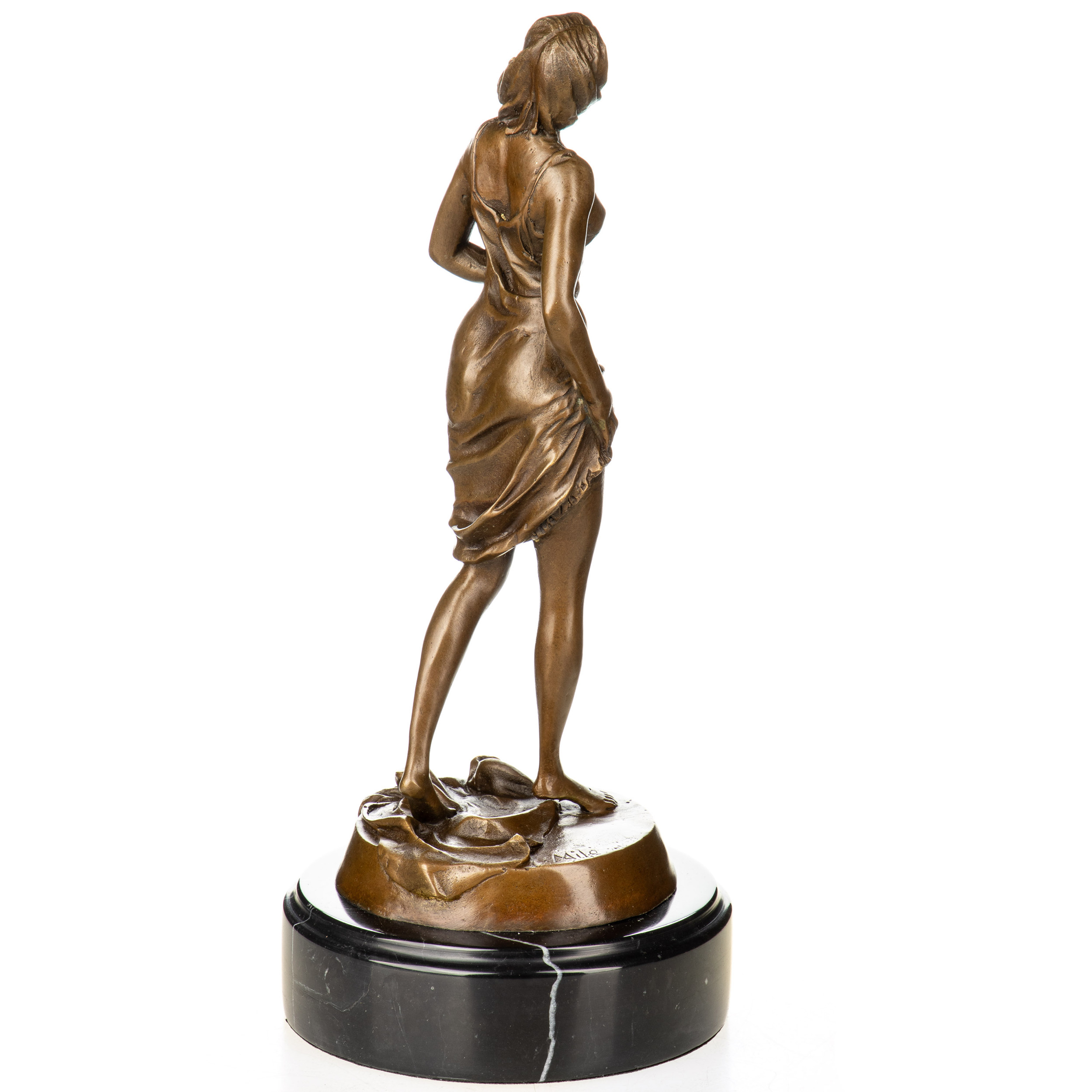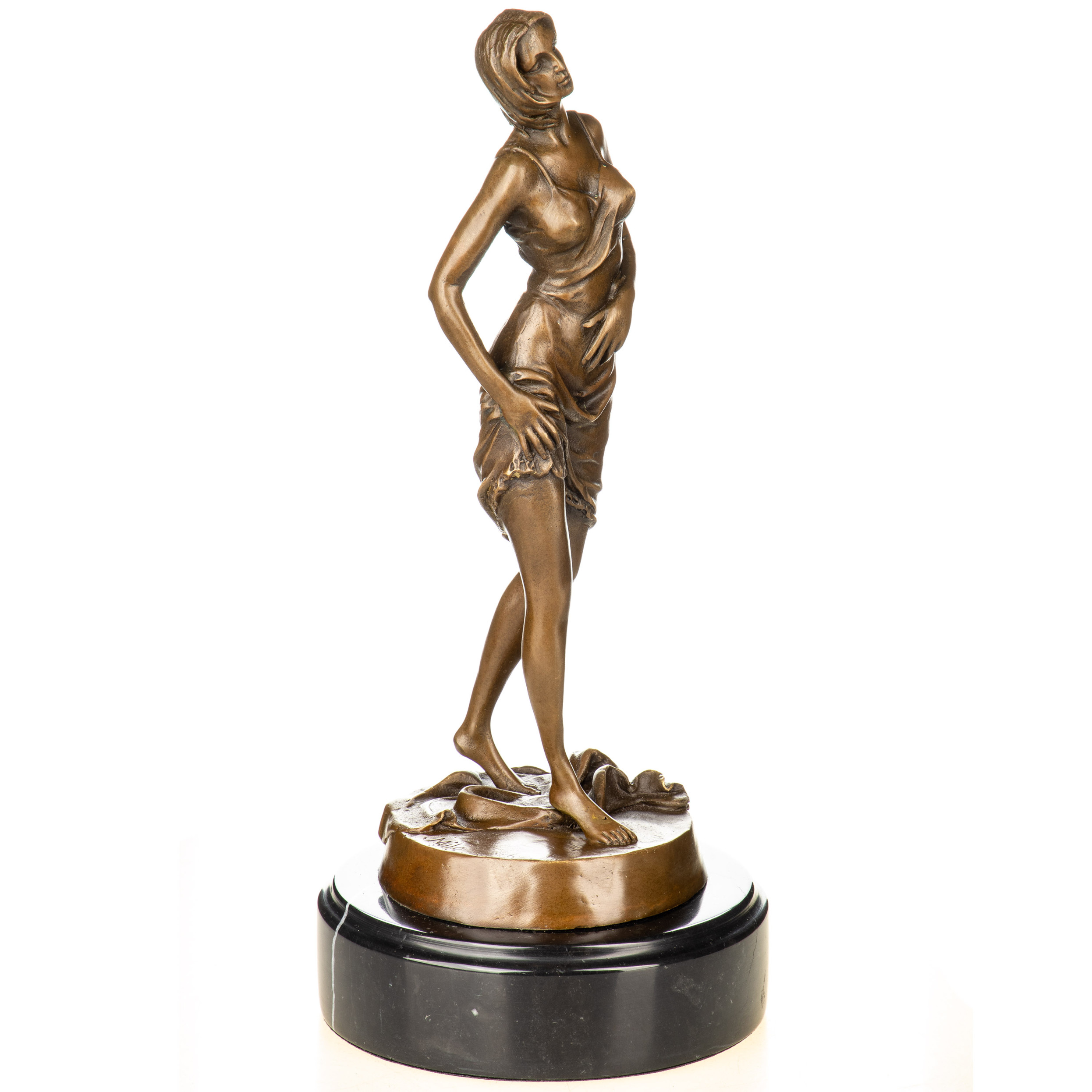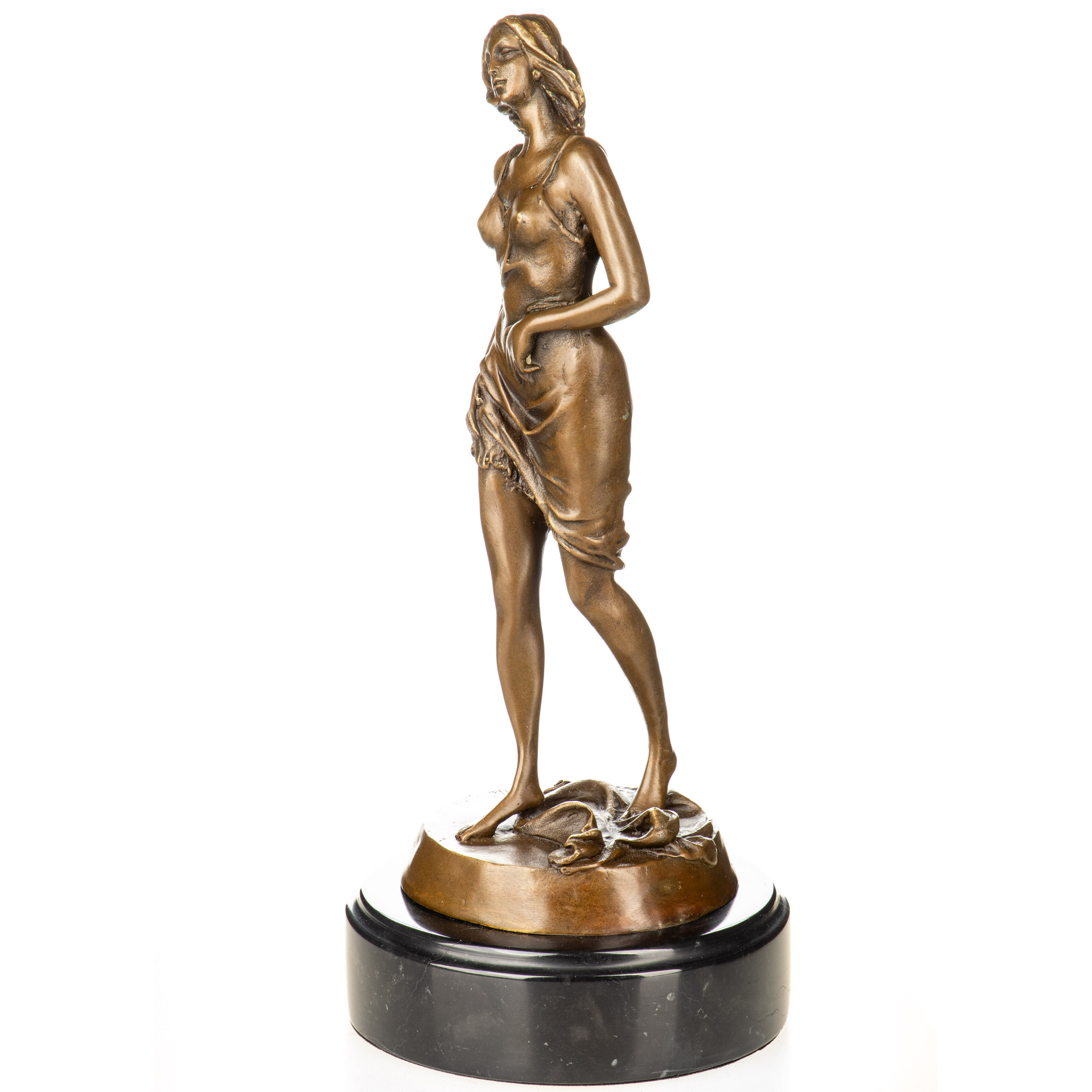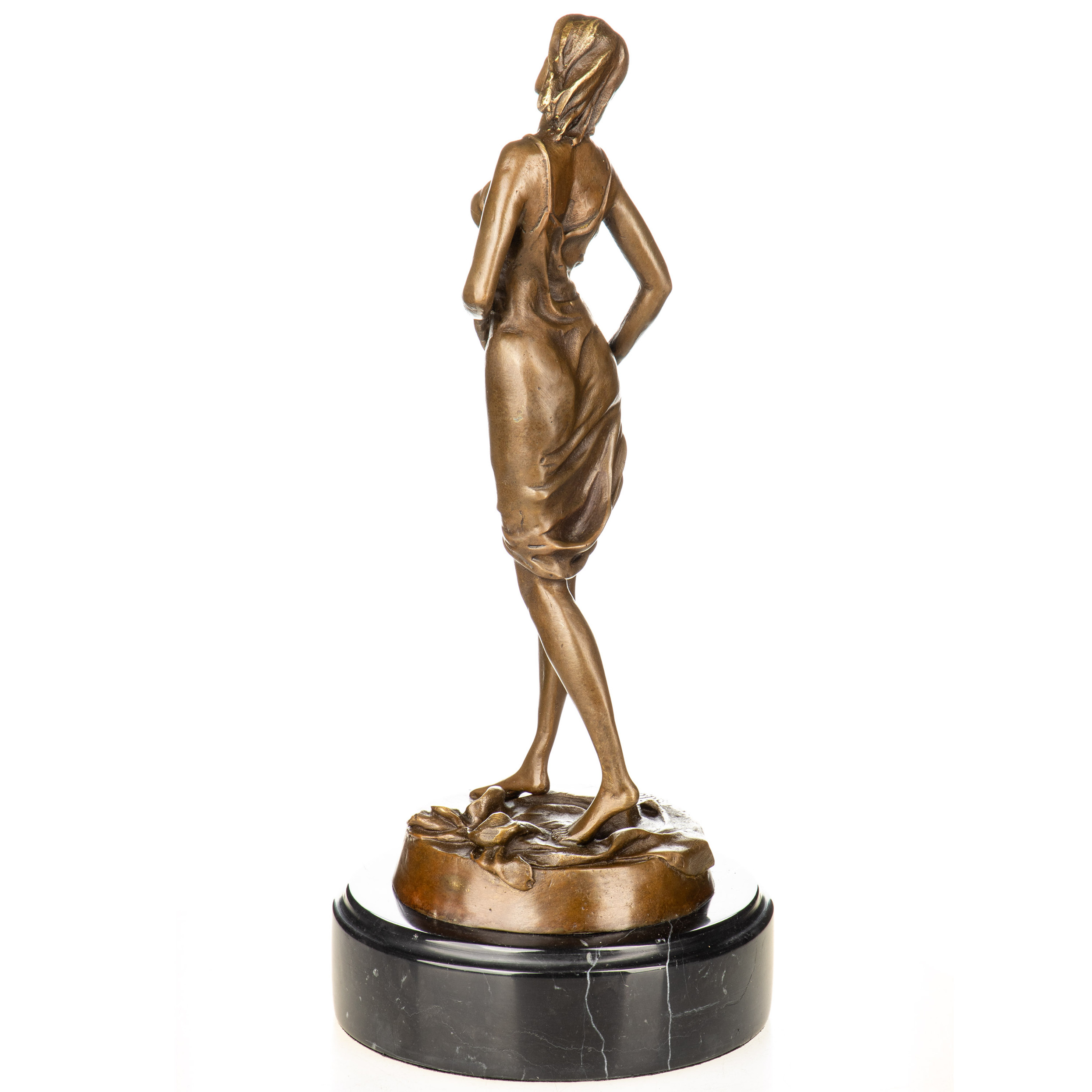 Bronzefigur Frau in Nachtkleid 31x13x13cm. Bronzefiguren aus verschiedenen Stilrichtungen und in unterschiedlichen Größen warten darauf, Dein häusliches Ambiente zu verzaubern. Eine Bronzefigur wirkt immer stilvoll und künstlerisch. Ob auf dem Schreibtisch oder in Regal und Vitrine, eine Bronzefigur verschönert ihre Umgebung und zieht die Blicke auf sich. Aber nicht nur in Wohnung und Haus, auch draußen, zum Beispiel im Eingangsbereich, im Garten oder am Teich kann sie ihre Wirkung entfalten. Frostsicherheit, lebenslange Haltbarkeit und edle Erscheinung sind ihre Vorteile.