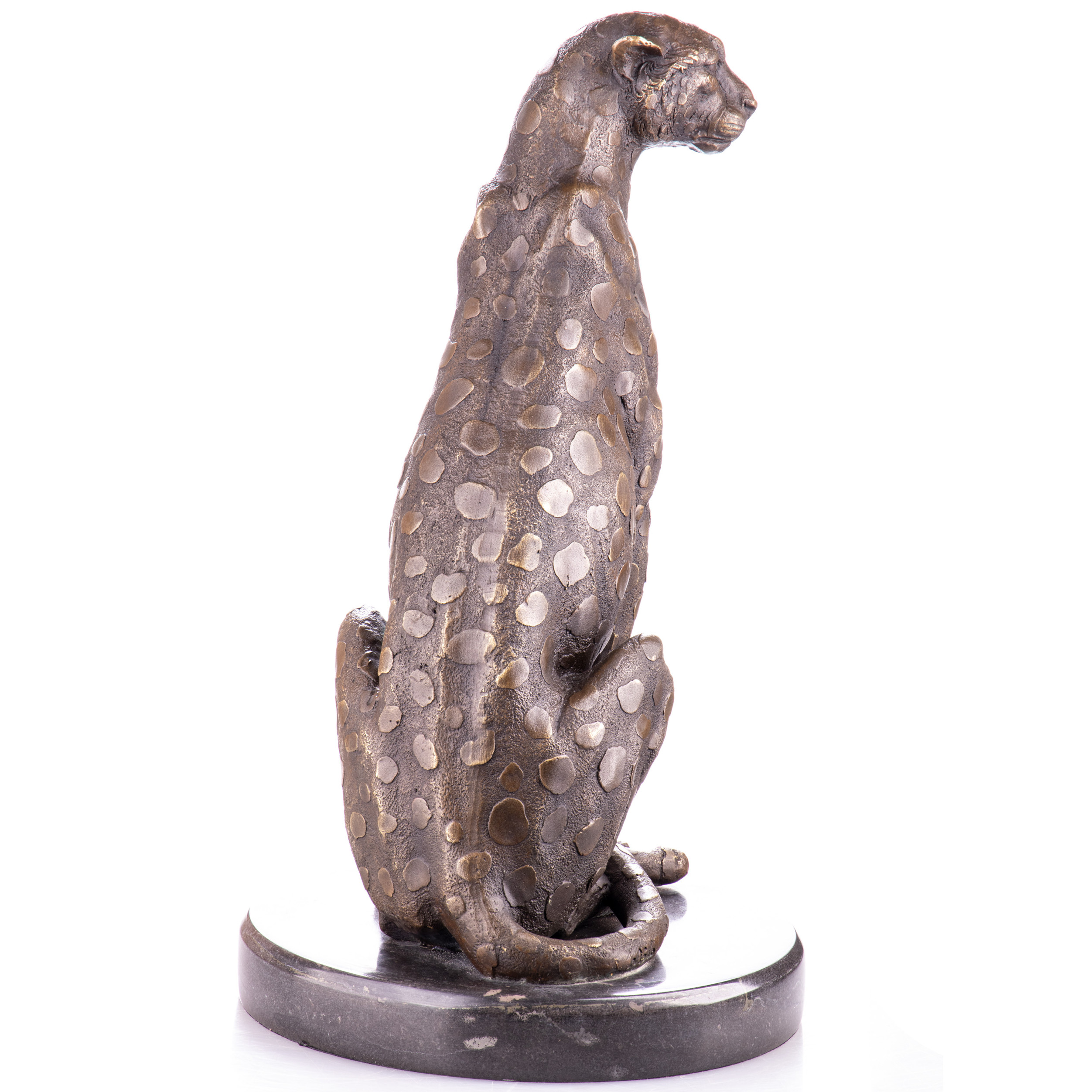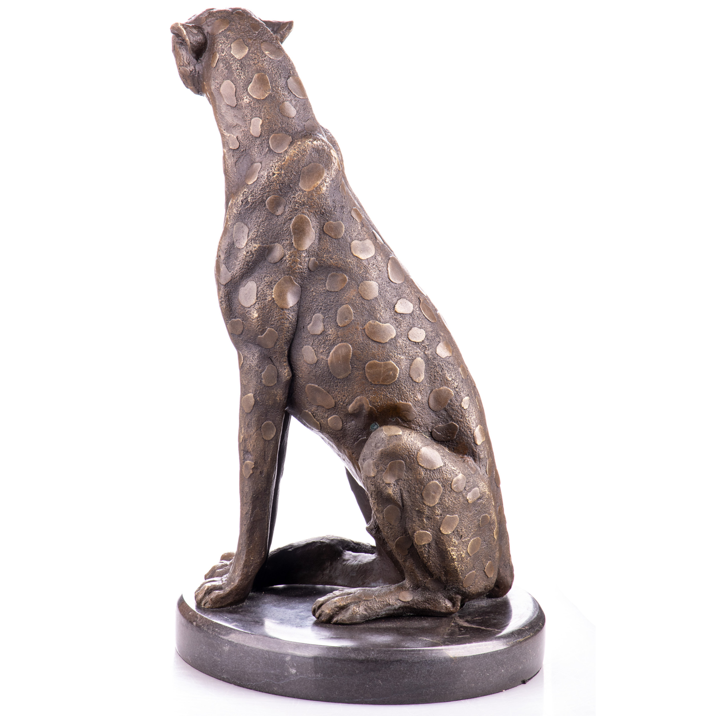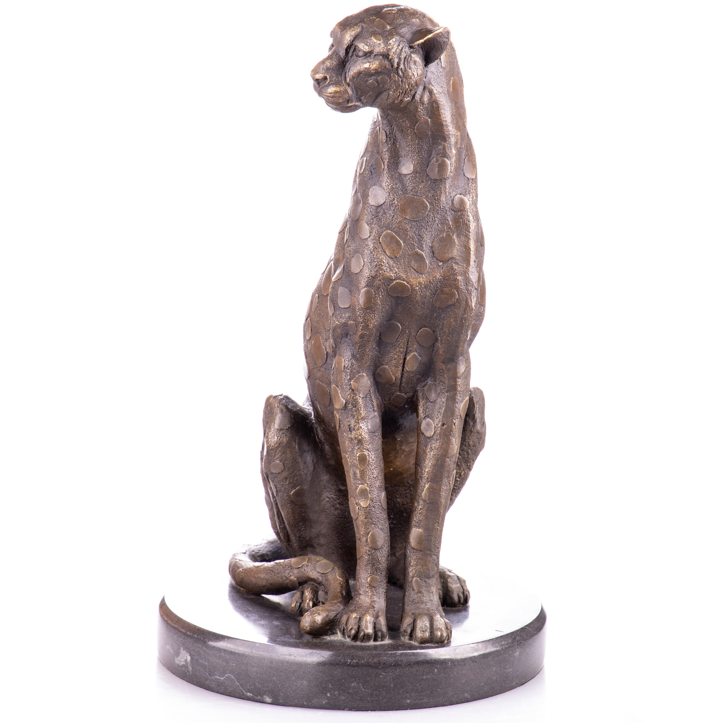 Bronzefigur Gepard 39x22x22cm. Bronzefiguren aus verschiedenen Stilrichtungen und in unterschiedlichen Größen warten darauf, Dein häusliches Ambiente zu verzaubern. Eine Bronzefigur wirkt immer stilvoll und künstlerisch. Ob auf dem Schreibtisch oder in Regal und Vitrine, eine Bronzefigur verschönert ihre Umgebung und zieht die Blicke auf sich. Aber nicht nur in Wohnung und Haus, auch draußen, zum Beispiel im Eingangsbereich, im Garten oder am Teich kann sie ihre Wirkung entfalten. Frostsicherheit, lebenslange Haltbarkeit und edle Erscheinung sind ihre Vorteile.