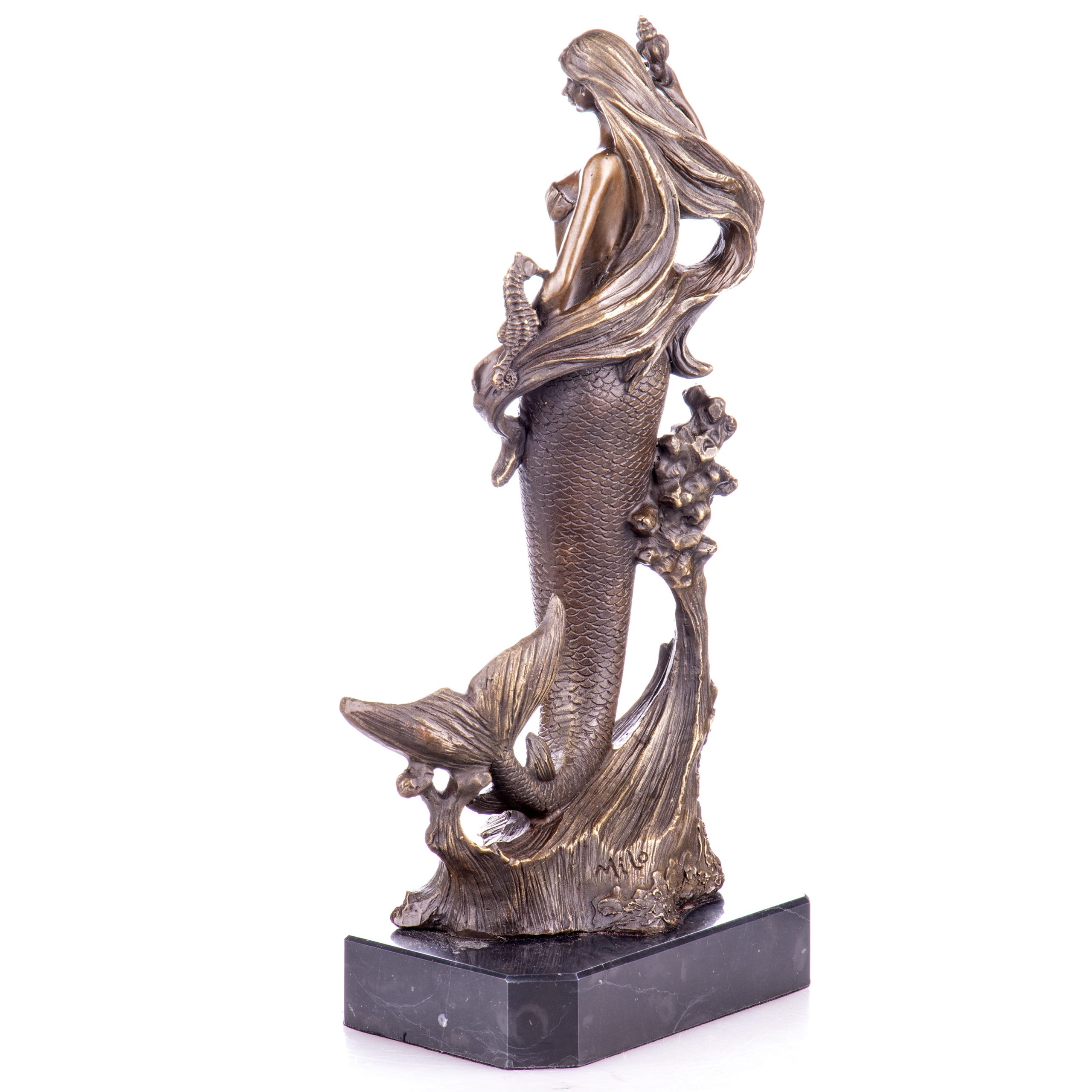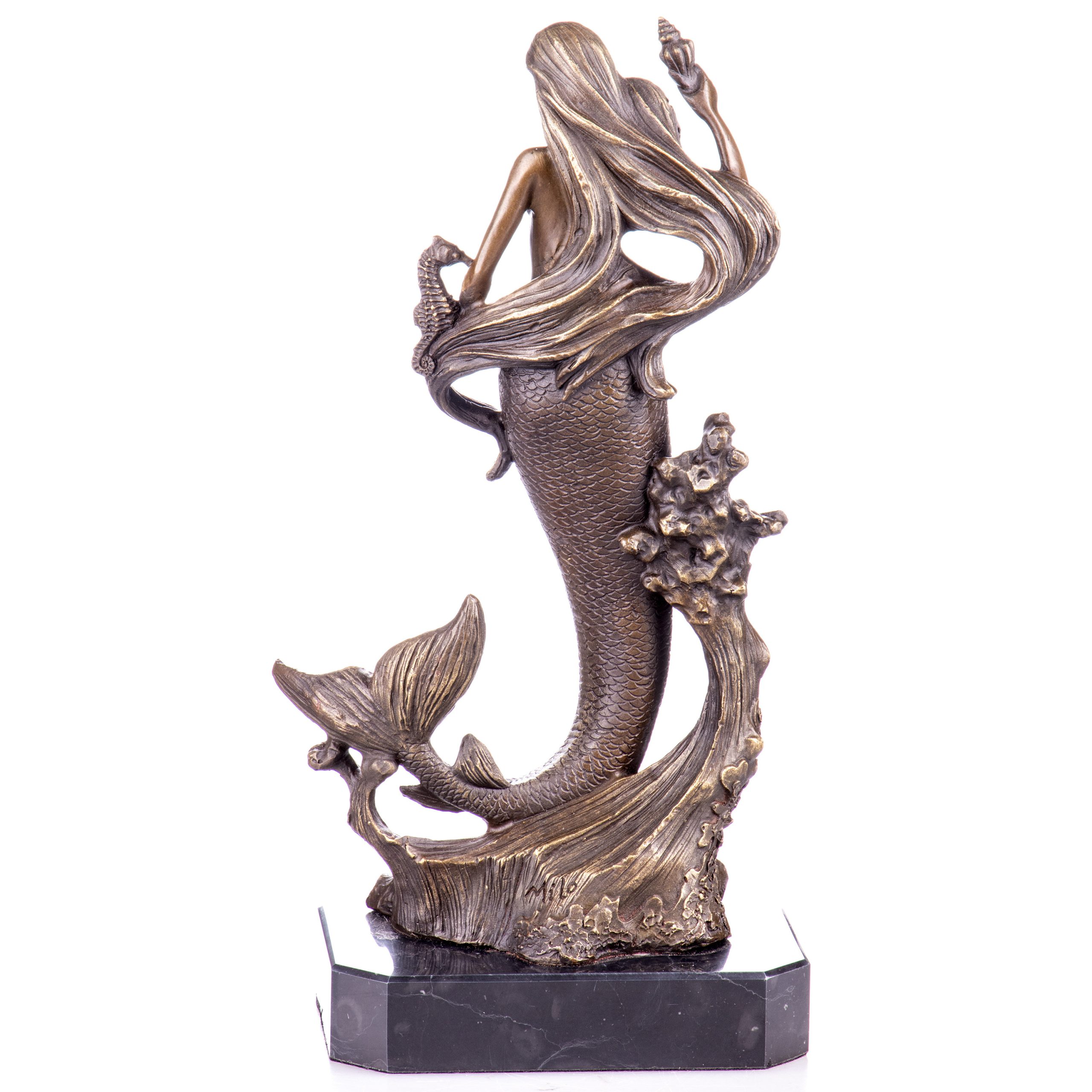 Bronzefigur „Meerjungfrau“ 33x17x10cm. Bronzefiguren aus verschiedenen Stilrichtungen und in unterschiedlichen Größen warten darauf, Dein häusliches Ambiente zu verzaubern. Eine Bronzefigur wirkt immer stilvoll und künstlerisch. Ob auf dem Schreibtisch oder in Regal und Vitrine, eine Bronzefigur verschönert ihre Umgebung und zieht die Blicke auf sich. Aber nicht nur in Wohnung und Haus, auch draußen, zum Beispiel im Eingangsbereich, im Garten oder am Teich kann sie ihre Wirkung entfalten. Frostsicherheit, lebenslange Haltbarkeit und edle Erscheinung sind ihre Vorteile.