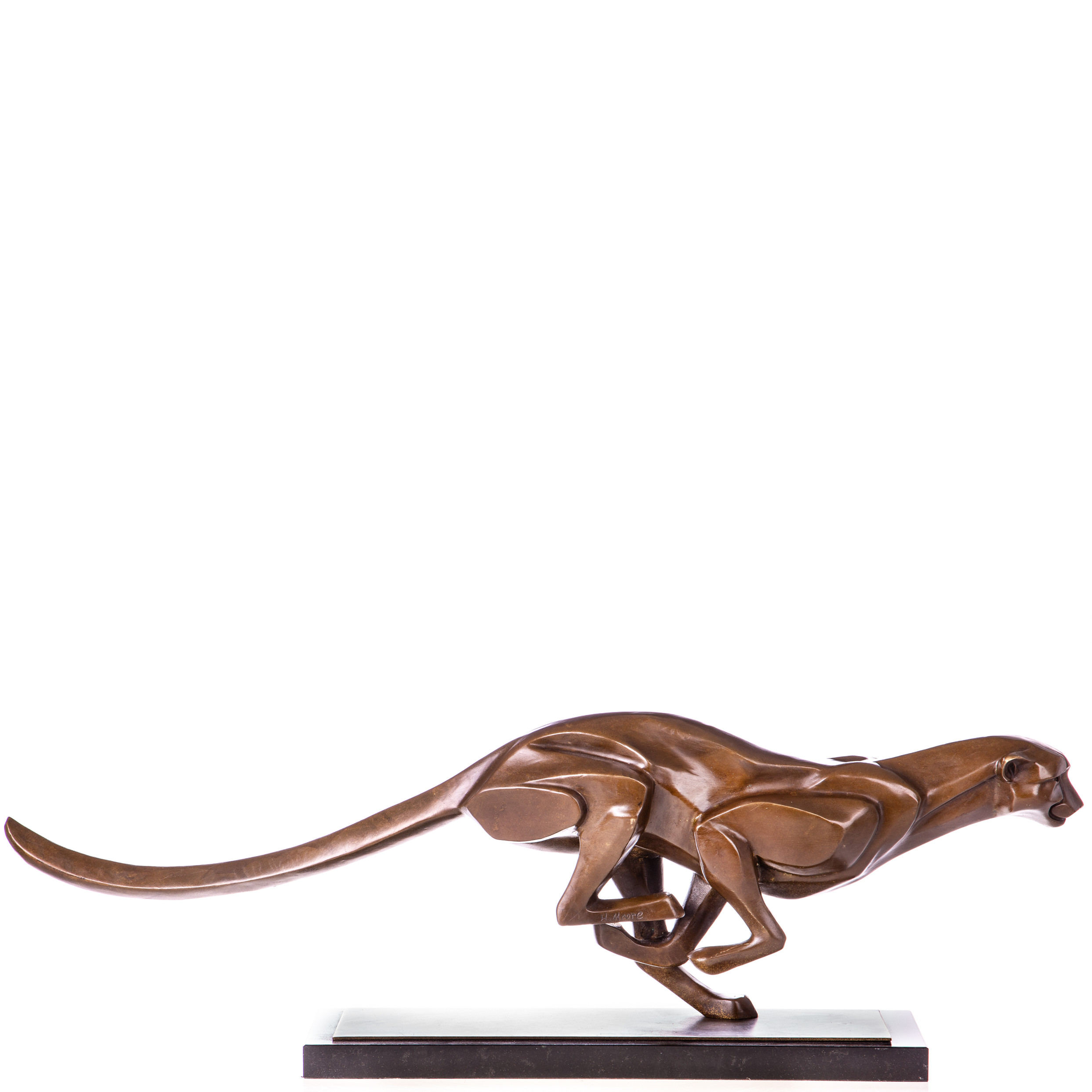 Bronzefigur Panther 28x90x15cm. Bronzefiguren aus verschiedenen Stilrichtungen und in unterschiedlichen Größen warten darauf, Dein häusliches Ambiente zu verzaubern. Eine Bronzefigur wirkt immer stilvoll und künstlerisch. Ob auf dem Schreibtisch oder in Regal und Vitrine, eine Bronzefigur verschönert ihre Umgebung und zieht die Blicke auf sich. Aber nicht nur in Wohnung und Haus, auch draußen, zum Beispiel im Eingangsbereich, im Garten oder am Teich kann sie ihre Wirkung entfalten. Frostsicherheit, lebenslange Haltbarkeit und edle Erscheinung sind ihre Vorteile.