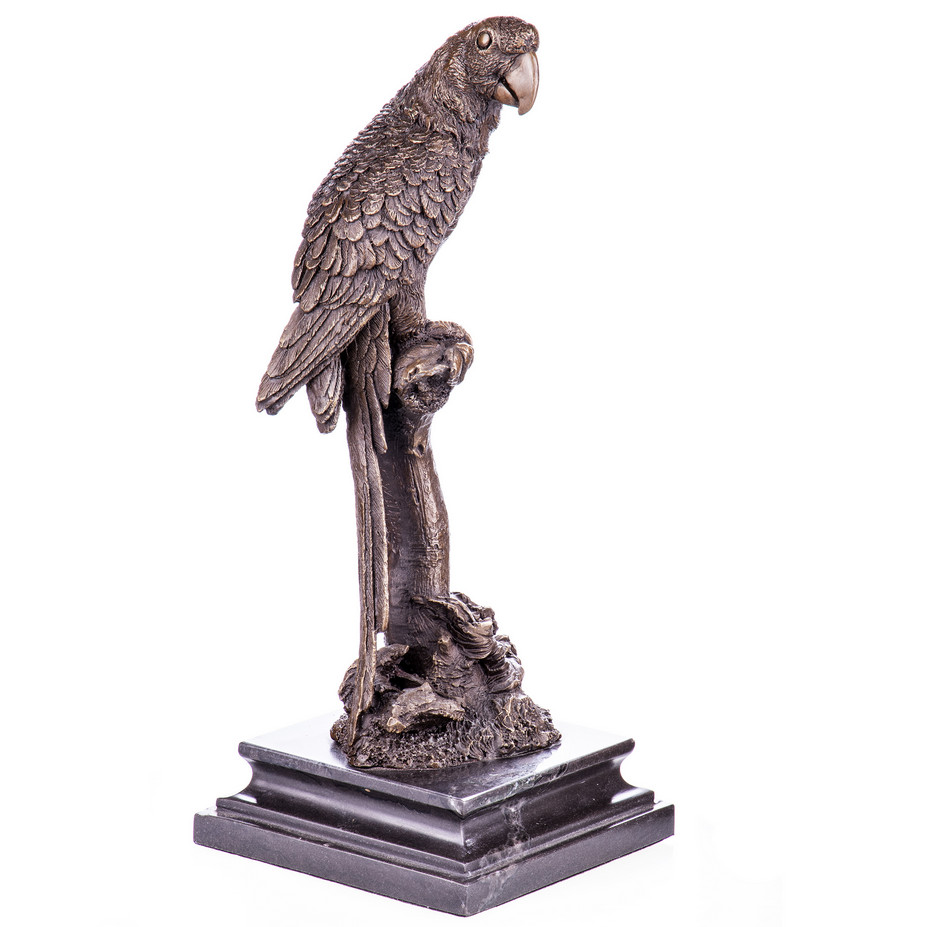 Bronzefigur „Papagei“ 33x14x14cm. Bronzefiguren aus verschiedenen Stilrichtungen und in unterschiedlichen Größen warten darauf, Dein häusliches Ambiente zu verzaubern. Eine Bronzefigur wirkt immer stilvoll und künstlerisch. Ob auf dem Schreibtisch oder in Regal und Vitrine, eine Bronzefigur verschönert ihre Umgebung und zieht die Blicke auf sich. Aber nicht nur in Wohnung und Haus, auch draußen, zum Beispiel im Eingangsbereich, im Garten oder am Teich kann sie ihre Wirkung entfalten. Frostsicherheit, lebenslange Haltbarkeit und edle Erscheinung sind ihre Vorteile.