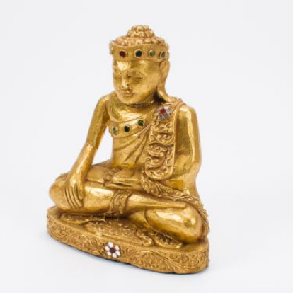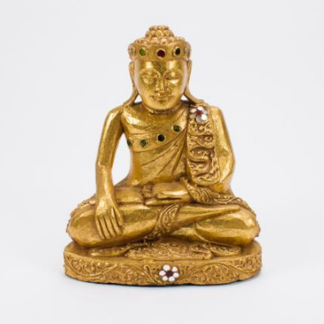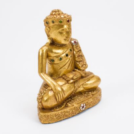 Buddhistische Figur – „Buddha sitzend mit Blattgold“ 30cm. Buddha symbolisiert die erleuchtete Qualität des Geistes, die alle Lebewesen verwirklichen können. Alle anderen Qualitäten, die man sich denken kann, symbolisiert er ebenfalls in einer vollkommenen, reinen Form. Unzulänglichkeiten der menschlichen Existenz können überwunden werden, indem man den Geist trainiert. Die erleuchtete Qualität des Geistes bleibt übrig.