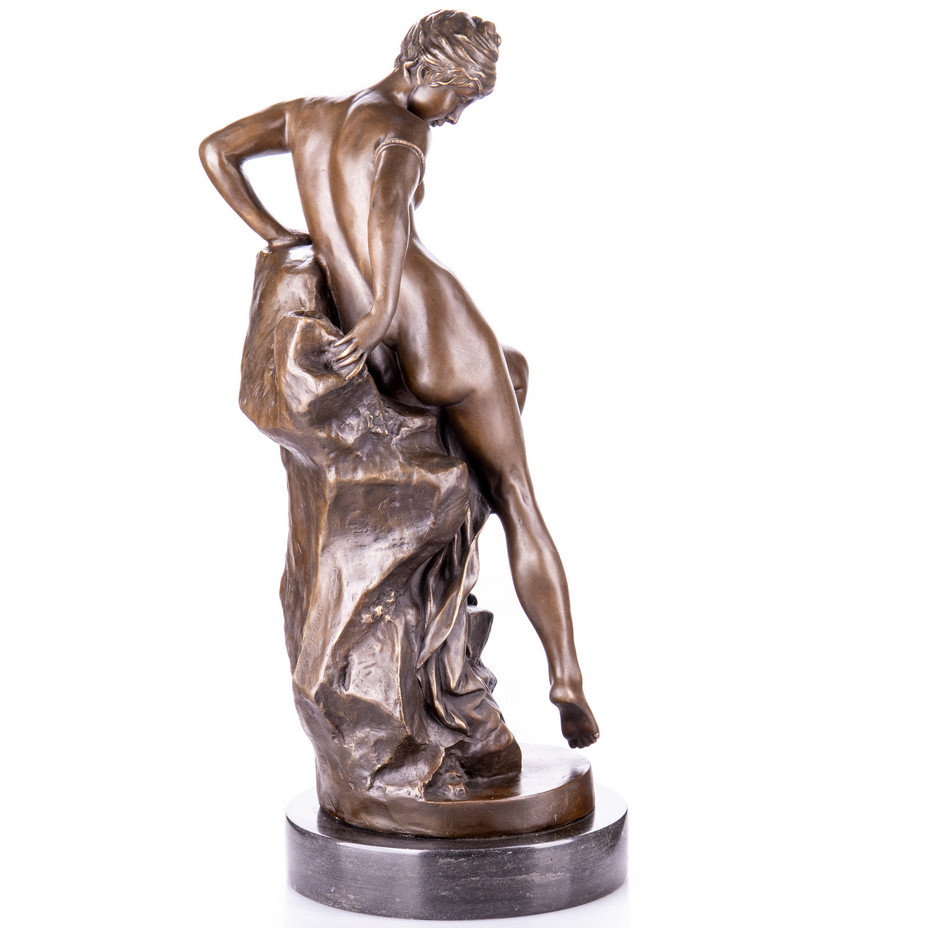 Erotische Bronzefigur „Badende Frau“ 66x32x26cm. Bronzefiguren aus verschiedenen Stilrichtungen und in unterschiedlichen Größen warten darauf, Dein häusliches Ambiente zu verzaubern. Eine Bronzefigur wirkt immer stilvoll und künstlerisch. Ob auf dem Schreibtisch oder in Regal und Vitrine, eine Bronzefigur verschönert ihre Umgebung und zieht die Blicke auf sich. Aber nicht nur in Wohnung und Haus, auch draußen, zum Beispiel im Eingangsbereich, im Garten oder am Teich kann sie ihre Wirkung entfalten. Frostsicherheit, lebenslange Haltbarkeit und edle Erscheinung sind ihre Vorteile.