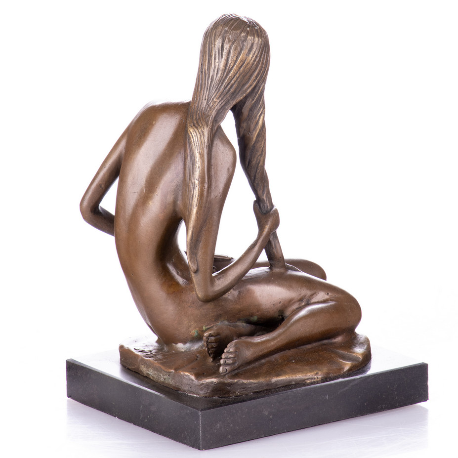 Erotische Bronzefigur „Weiblicher Akt“ 20x14x11cm. Bronzefiguren aus verschiedenen Stilrichtungen und in unterschiedlichen Größen warten darauf, Dein häusliches Ambiente zu verzaubern. Eine Bronzefigur wirkt immer stilvoll und künstlerisch. Ob auf dem Schreibtisch oder in Regal und Vitrine, eine Bronzefigur verschönert ihre Umgebung und zieht die Blicke auf sich. Aber nicht nur in Wohnung und Haus, auch draußen, zum Beispiel im Eingangsbereich, im Garten oder am Teich kann sie ihre Wirkung entfalten. Frostsicherheit, lebenslange Haltbarkeit und edle Erscheinung sind ihre Vorteile.