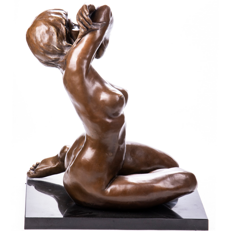 Erotische Bronzefigur „Weiblicher Akt“ 68x56x45cm. Bronzefiguren aus verschiedenen Stilrichtungen und in unterschiedlichen Größen warten darauf, Dein häusliches Ambiente zu verzaubern. Eine Bronzefigur wirkt immer stilvoll und künstlerisch. Ob auf dem Schreibtisch oder in Regal und Vitrine, eine Bronzefigur verschönert ihre Umgebung und zieht die Blicke auf sich. Aber nicht nur in Wohnung und Haus, auch draußen, zum Beispiel im Eingangsbereich, im Garten oder am Teich kann sie ihre Wirkung entfalten. Frostsicherheit, lebenslange Haltbarkeit und edle Erscheinung sind ihre Vorteile.