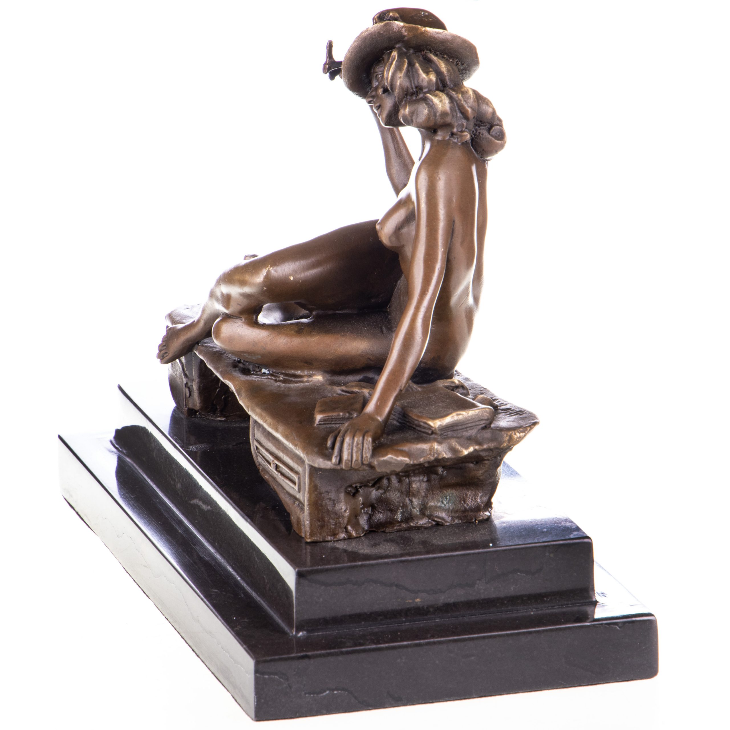 Erotische Bronzefigur „Weiblicher Akt auf Schreibtisch“ 19x23x12cm. Bronzefiguren aus verschiedenen Stilrichtungen und in unterschiedlichen Größen warten darauf, Dein häusliches Ambiente zu verzaubern. Eine Bronzefigur wirkt immer stilvoll und künstlerisch. Ob auf dem Schreibtisch oder in Regal und Vitrine, eine Bronzefigur verschönert ihre Umgebung und zieht die Blicke auf sich. Aber nicht nur in Wohnung und Haus, auch draußen, zum Beispiel im Eingangsbereich, im Garten oder am Teich kann sie ihre Wirkung entfalten. Frostsicherheit, lebenslange Haltbarkeit und edle Erscheinung sind ihre Vorteile.