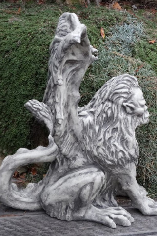 Fabelwesen Mantikor Steinguss. Der Mantikor ist ein Mischwesen mit dem Körper eines Löwen, dem Schwanz eines Drachens und in manchen Darstellungen auch mit Flügeln. Sein Gesicht, das durch drei hintereinander gelegene Zahnreihen entstellt ist, und die Ohren ähneln denen eines Menschen. Der Mantikor kann giftige Stacheln wie Pfeile abfeuern. In manchen Versionen kann er diese Pfeile auch aus seiner Mähne schießen. Er tötet jedoch auch mit seinen Krallen, ist sehr gewandt, kann kraftvolle Sprünge machen und hat eine sehr laute Stimme.