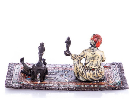 Farbige Bronzefigur „Händler auf Teppich“. Bronzefiguren aus verschiedenen Stilrichtungen und in unterschiedlichen Größen warten darauf, Dein häusliches Ambiente zu verzaubern. Eine Bronzefigur wirkt immer stilvoll und künstlerisch. Ob auf dem Schreibtisch oder in Regal und Vitrine, eine Bronzefigur verschönert ihre Umgebung und zieht die Blicke auf sich. Aber nicht nur in Wohnung und Haus, auch draußen, zum Beispiel im Eingangsbereich, im Garten oder am Teich kann sie ihre Wirkung entfalten. Frostsicherheit, lebenslange Haltbarkeit und edle Erscheinung sind ihre Vorteile.