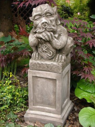 Gargoylesockel klein, © by Fiona Scott. Gargoyles oder Wächter haben eine Beschützerfunktion. Durch ihr Aussehen soll bösen Geistern und Dämonen ein Spiegel vorgehalten werden und diese somit von Kirchen, Klöstern und manchmal auch Burgen ferngehalten werden. Beschützen ist seine Aufgabe. Gerüstet, wie er ist, kommt nichts Böses an ihm vorbei. Noch nicht einmal Schlangen. Steht der Gargoyle auf diesem Sockel, kann er Deinen ganzen Garten überwachen.