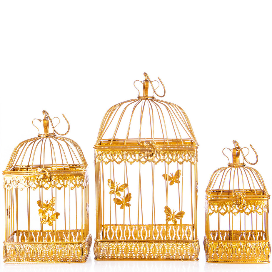 Gartendeko aus Metall – Vogelkäfige 3er Set gold