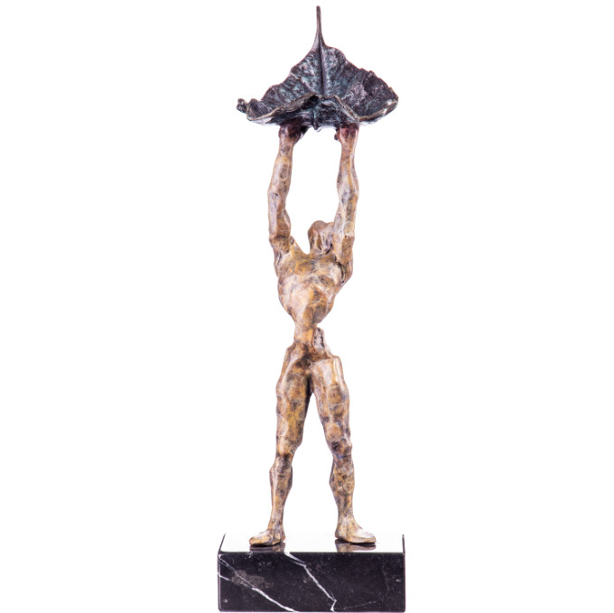 Moderne Bronze Figur „Mann mit Blatt“ stehend 42cm. Bronzefiguren aus verschiedenen Stilrichtungen und in unterschiedlichen Größen warten darauf, Dein häusliches Ambiente zu verzaubern. Eine Bronzefigur wirkt immer stilvoll und künstlerisch. Ob auf dem Schreibtisch oder in Regal und Vitrine, eine Bronzefigur verschönert ihre Umgebung und zieht die Blicke auf sich. Aber nicht nur in Wohnung und Haus, auch draußen, zum Beispiel im Eingangsbereich, im Garten oder am Teich kann sie ihre Wirkung entfalten. Frostsicherheit, lebenslange Haltbarkeit und edle Erscheinung sind ihre Vorteile.