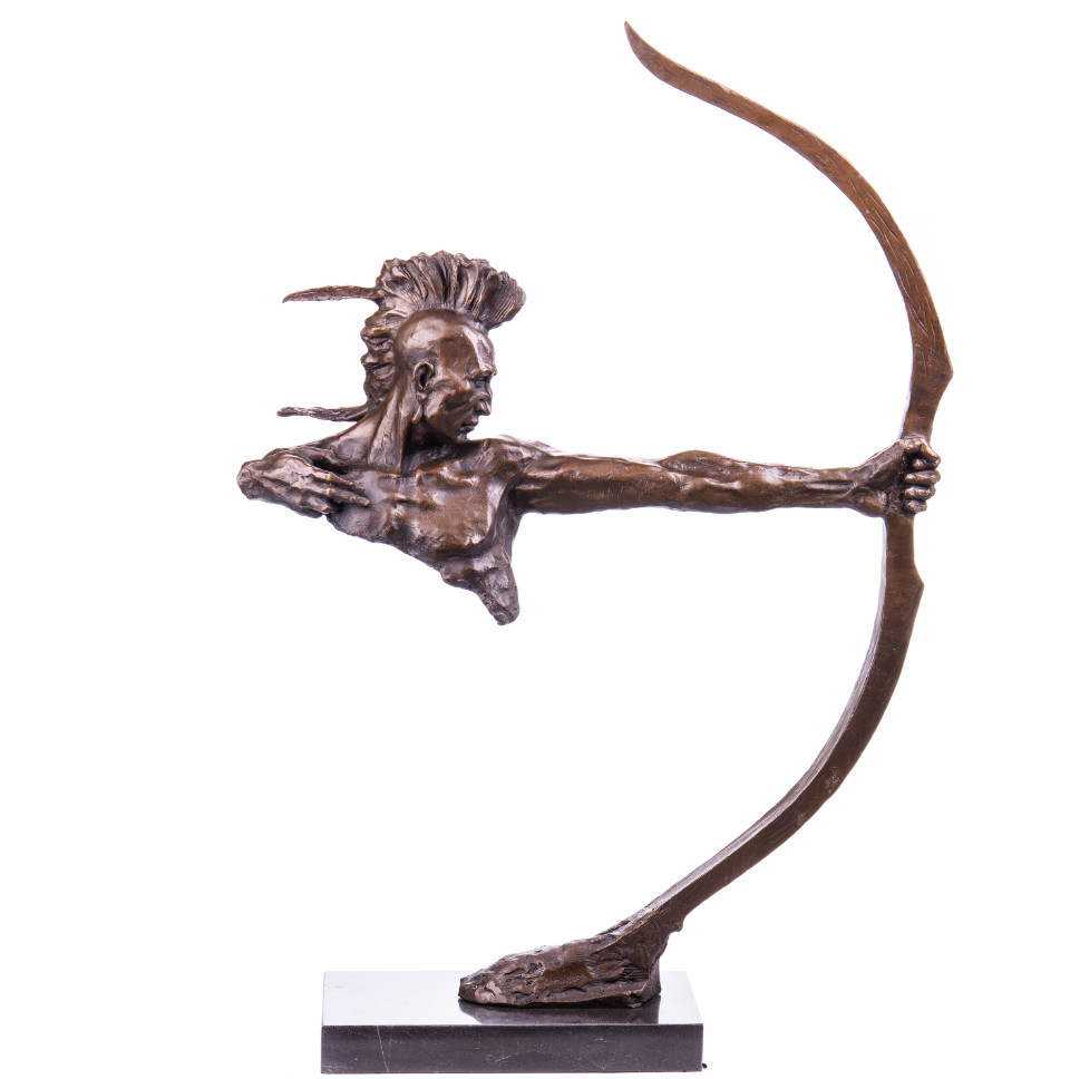 Moderne Bronzefigur Indianer mit Bogen 85x59x17cm. Bronzefiguren aus verschiedenen Stilrichtungen und in unterschiedlichen Größen warten darauf, Dein häusliches Ambiente zu verzaubern. Eine Bronzefigur wirkt immer stilvoll und künstlerisch. Ob auf dem Schreibtisch oder in Regal und Vitrine, eine Bronzefigur verschönert ihre Umgebung und zieht die Blicke auf sich. Aber nicht nur in Wohnung und Haus, auch draußen, zum Beispiel im Eingangsbereich, im Garten oder am Teich kann sie ihre Wirkung entfalten. Frostsicherheit, lebenslange Haltbarkeit und edle Erscheinung sind ihre Vorteile.