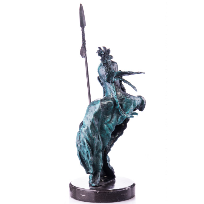 Moderne Bronzefigur Indianer mit Speer mit grüner Patina 61cm. Bronzefiguren aus verschiedenen Stilrichtungen und in unterschiedlichen Größen warten darauf, Dein häusliches Ambiente zu verzaubern. Eine Bronzefigur wirkt immer stilvoll und künstlerisch. Ob auf dem Schreibtisch oder in Regal und Vitrine, eine Bronzefigur verschönert ihre Umgebung und zieht die Blicke auf sich. Aber nicht nur in Wohnung und Haus, auch draußen, zum Beispiel im Eingangsbereich, im Garten oder am Teich kann sie ihre Wirkung entfalten. Frostsicherheit, lebenslange Haltbarkeit und edle Erscheinung sind ihre Vorteile.