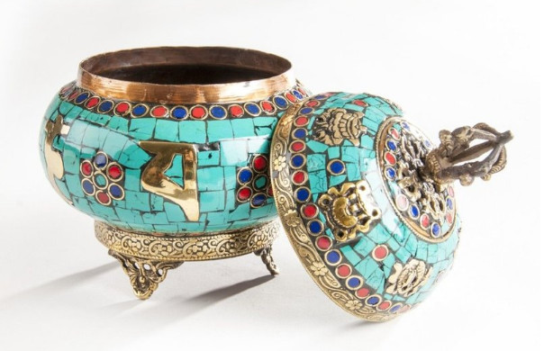 Reichhaltig mit indischen Türkisen, Lapis und Koralle bestücktes Gefäß mit Deckel. Oben mit Dorje. Exotisch und einfach ganz speziell – auch zum Aufbewahren Deiner kleinen Kostbarkeiten wie Edelsteinen, Deines Lieblingsräucherwerkes oder anderer Zaubereien geeignet.