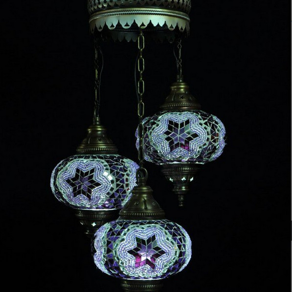 Türkischer Kronleuchter Lila 3 Kugeln 80x30cm. Beleuchtung aus dem Orient sind ein Garant für eine wohlige und warme Atmosphäre. Ihr unvergleichlicher Schein entsteht durch die immer wieder anders gestalteten mystischen Muster. Er taucht Deine Umgebung in ein geheimnisvolles, exotisches Licht. Verzierungen und Schattenspiele lassen einen nicht mehr aus ihrem Bann. Hier wird Orientspirits sichtbar. Die mystische Welt des Orients und der Geist Asiens in Deinem Heim.