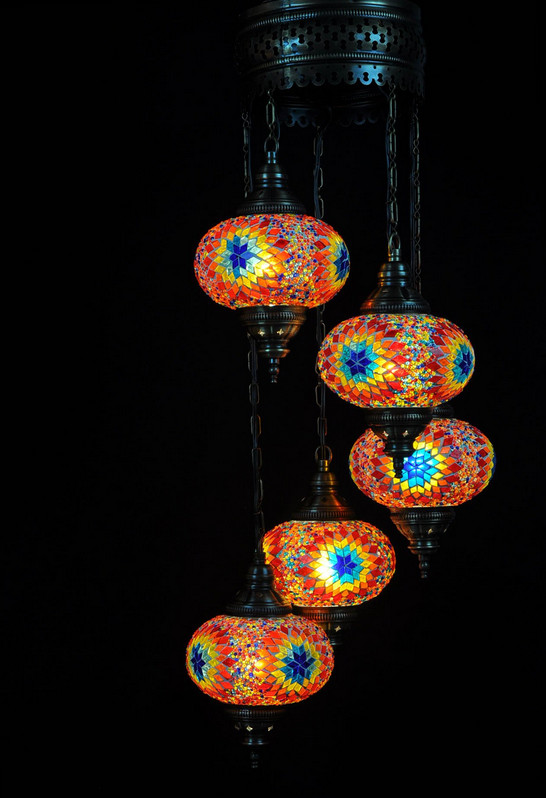 Türkischer Kronleuchter mehrfarbig 5 Kugeln 110x35cm. Beleuchtung aus dem Orient sind ein Garant für eine wohlige und warme Atmosphäre. Ihr unvergleichlicher Schein entsteht durch die immer wieder anders gestalteten mystischen Muster. Er taucht Deine Umgebung in ein geheimnisvolles, exotisches Licht. Verzierungen und Schattenspiele lassen einen nicht mehr aus ihrem Bann. Hier wird Orientspirits sichtbar. Die mystische Welt des Orients und der Geist Asiens in Deinem Heim.