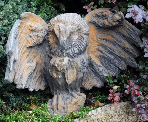 Wesen der Lüfte „Kleine Eule“ Steinguss Rosteffekt 28x31x27cm. Vögel symbolisieren geistige Inhalte, Gedanken und Ideen. Die seelische und geistige Lebenssphäre des Menschen wird durch das Leben der Vögel im Luftraum verdeutlicht. Der fliegende Vogel ist ein Sinnbild des Mnschheitstraums, der Erdanziehung zu entfliehen, geistige Sphären zu erreichen und dem Himmel nahe zu sein. Dieser Traum ist schon aus der Antike bekannt. Bei den alten Römern hatte der Vogelflug in der Weissagekunst eine große Bedeutung. Die Vögel – in der Mythologie sind es geheimnisvolle Wesen, eben Wesen der Lüfte.