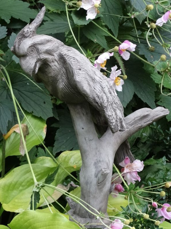 Wesen der Lüfte „Papagei“ dunkler Steinguss 46x20x34cm. Vögel symbolisieren geistige Inhalte, Gedanken und Ideen. Die seelische und geistige Lebenssphäre des Menschen wird durch das Leben der Vögel im Luftraum verdeutlicht. Der fliegende Vogel ist ein Sinnbild des Mnschheitstraums, der Erdanziehung zu entfliehen, geistige Sphären zu erreichen und dem Himmel nahe zu sein. Dieser Traum ist schon aus der Antike bekannt. Bei den alten Römern hatte der Vogelflug in der Weissagekunst eine große Bedeutung. Die Vögel – in der Mythologie sind es geheimnisvolle Wesen, eben Wesen der Lüfte.